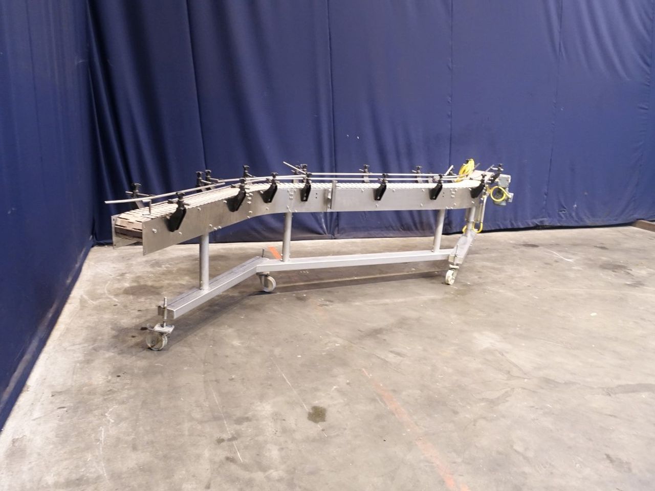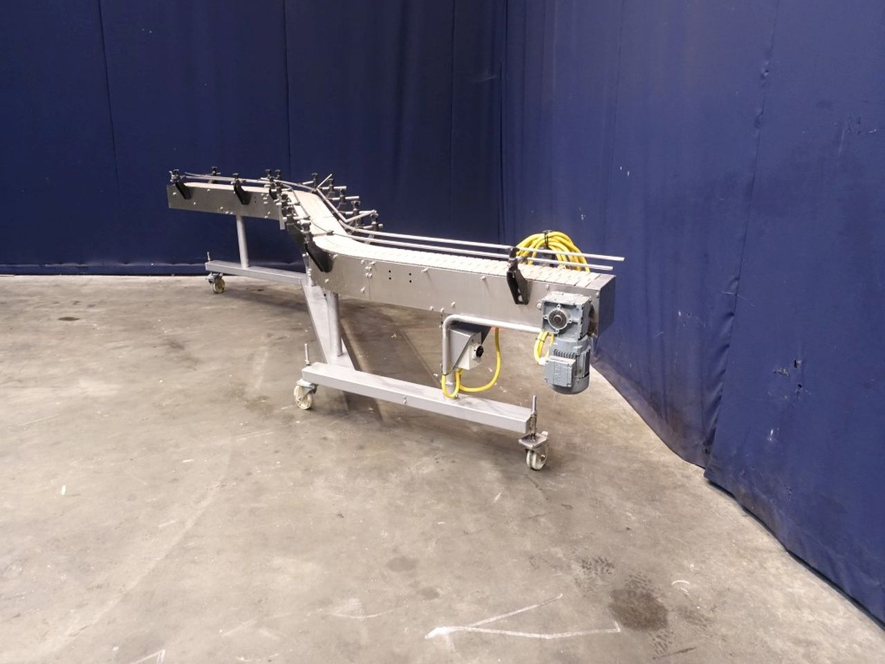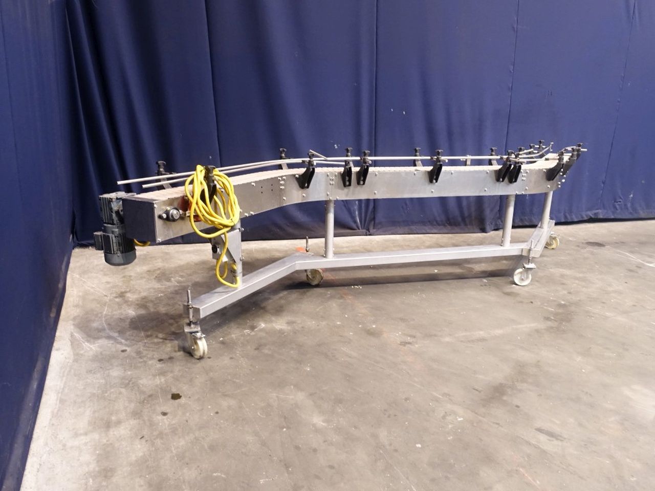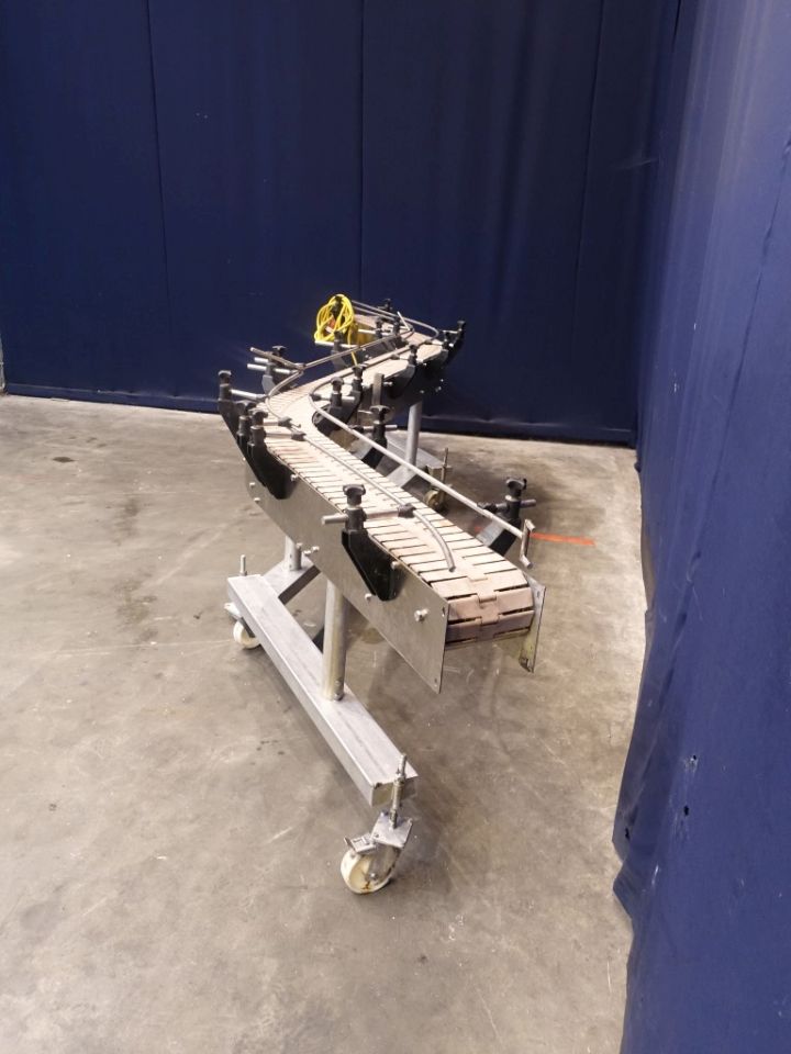 Mobile chain conveyor. Effective chain: 420 x 19 cm. Motor: 0,37 kW - n2: 35 rpm. Horizontal. Total Dimensions: 420 x 50 x 100 cm.