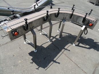 15 meter long and 0,26 meter width, twin lane stainless steel and plastic slat conveyor.