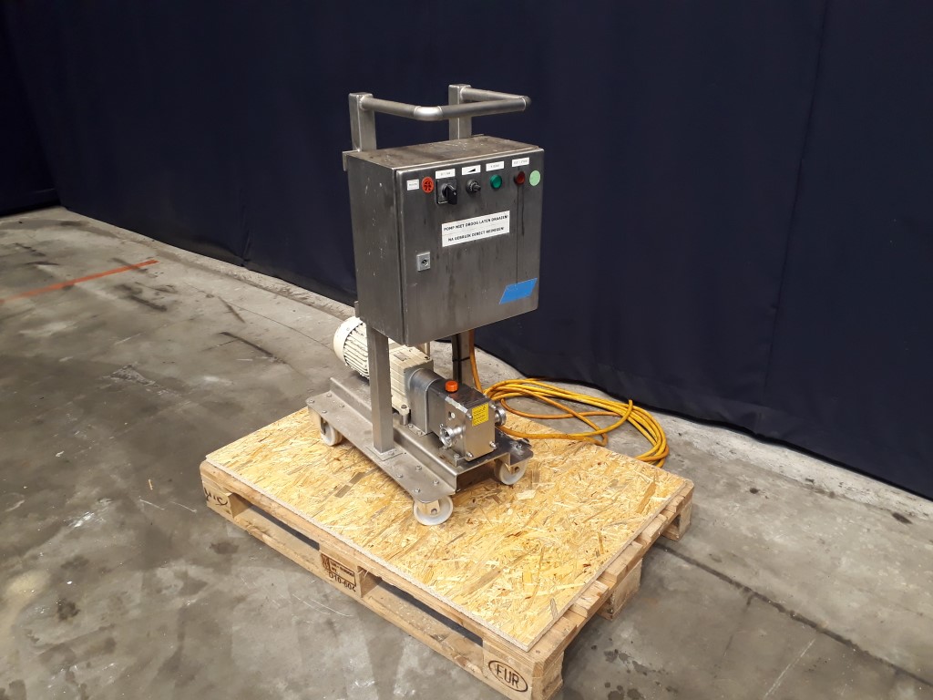 Lobbe pump with duo stainless steel lobbes. Diameter lobbes: 68 mm. Pressure up to 3 bar. Current motor: 0,75 kW - 1,9 A - n1: 1410 rpm, i=5,187, n2: 271 rpm. Displacement 6 ltr/100rev. Mobile. Connections: 1'' / 1''. Including control panel with frequency converter for variabel speed and electric scheme.