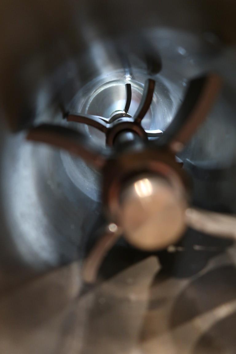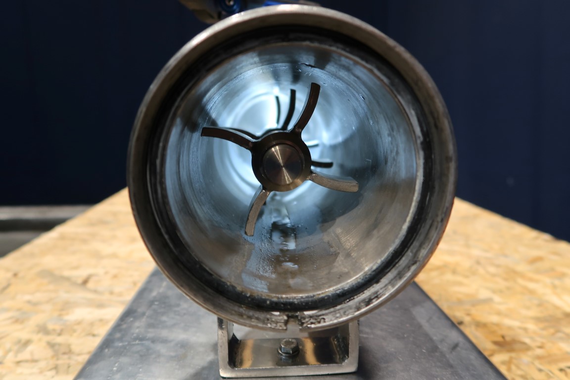 Präzisions Rührer Gesellschaft (PRG) inline mixer. Motor 0,55 kW . N2: 635-106 rpm. 3x mixing points of 4 blades on the rotor. Effective rotor length: 30 cm, total rotor lenght: 35 cm. Connections: In 4''/2'' DIN - Out DN65. Total dimensions: 125 x 28 x 25 cm.