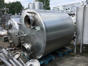 Vertical conical quark tank, insulated top and side, pressure in tank atmospherique, conical bottom with outfeed flat to the side, product outlet 63 mm DIN, pressure transmitter, temperature indicator, high and low level sensor, breather, 1 CIP spray bowl, manhole in top round diameter 45 cm, 3 adjustable feet. Innner dimensions of tank: diameter 150 cm, height 150 cm. Outside dimensions: diameter 170 cm, height 340 cm.
