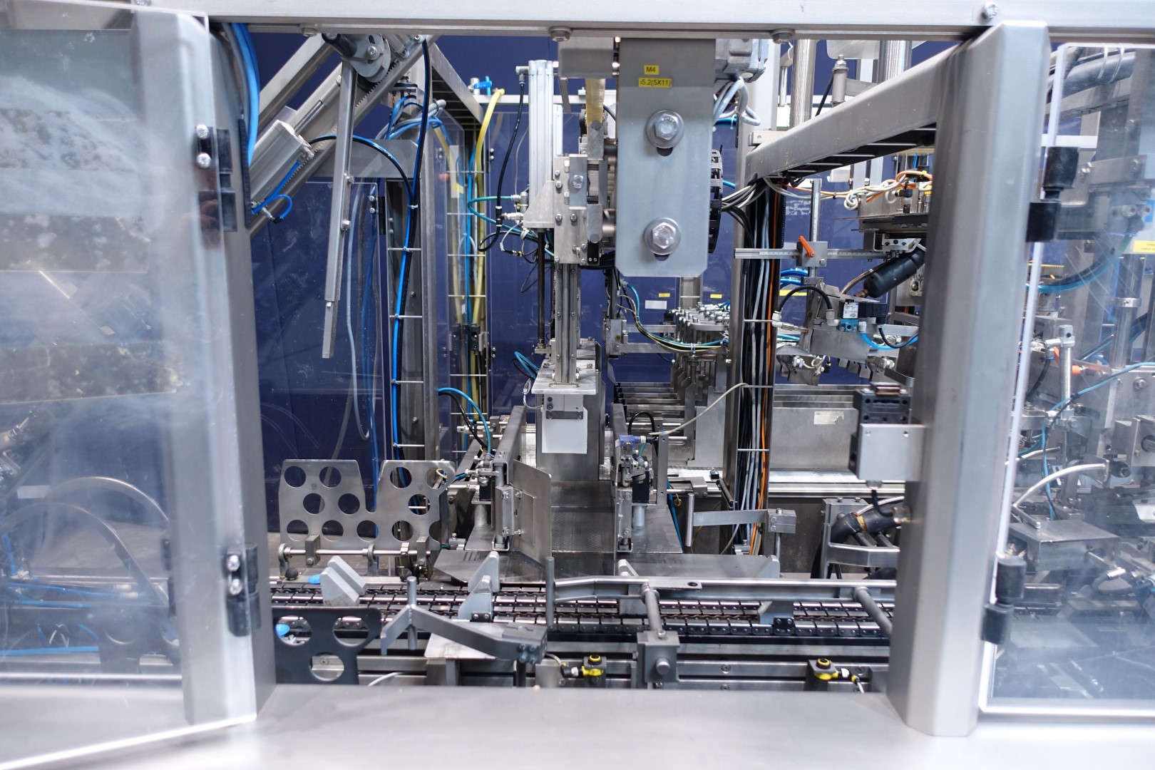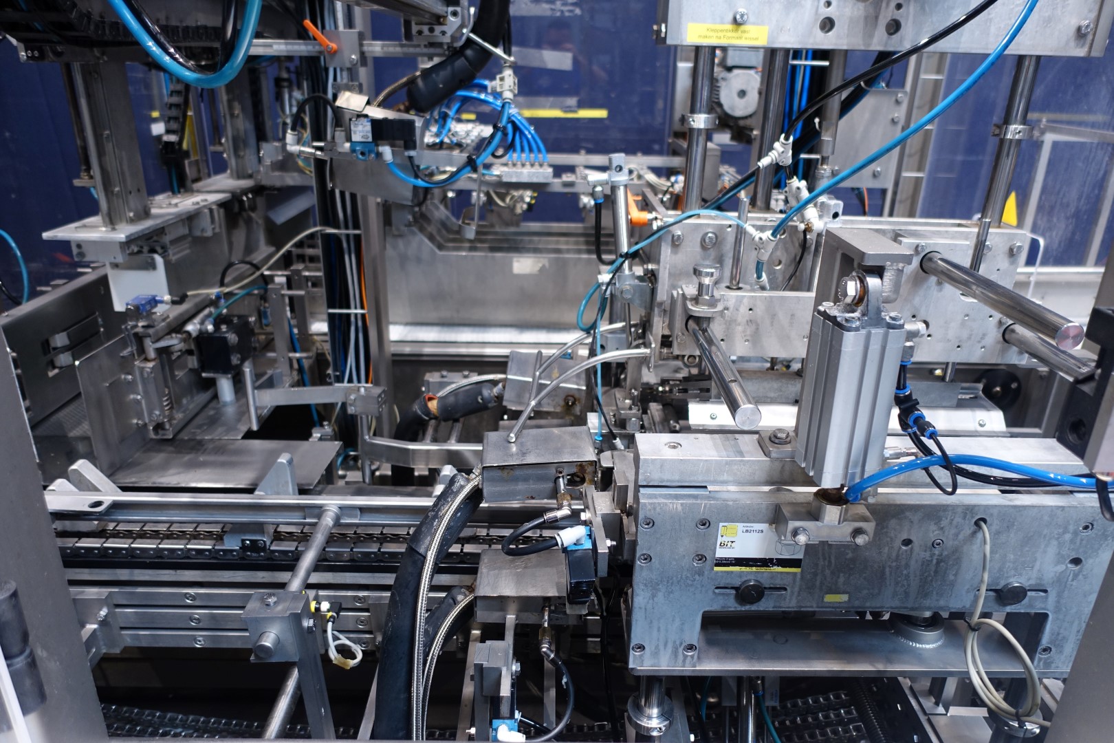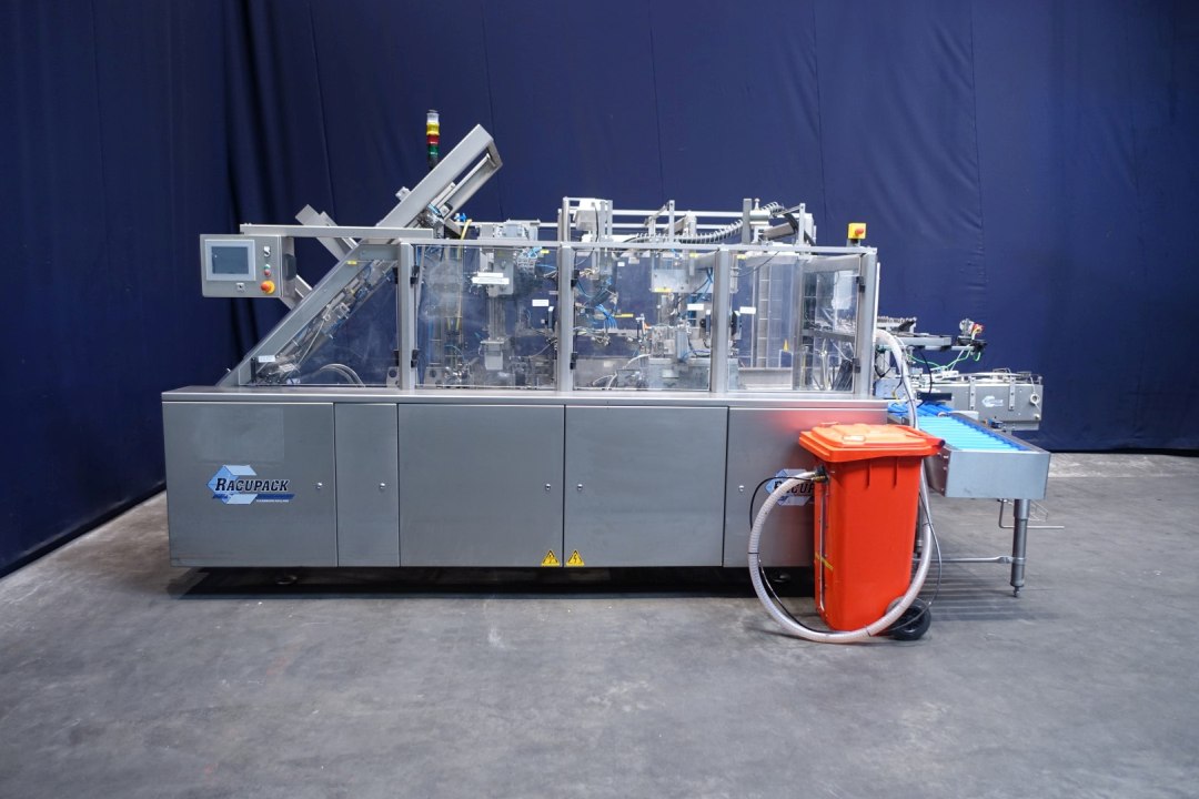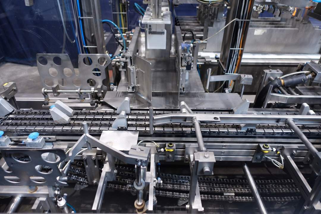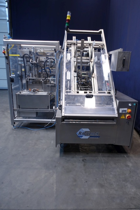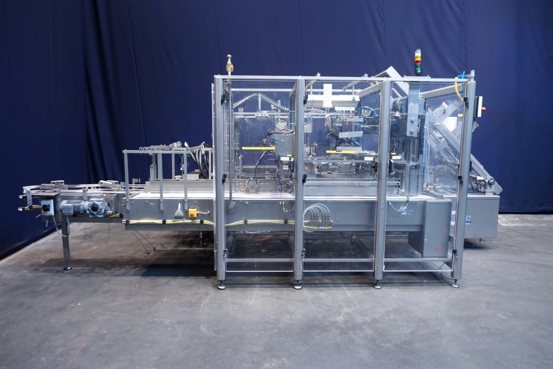 Fully automatic warp-around case packer, flexible format. Can be used to pack gable top cartons, bottles etc. in a wrap around plano carton. This machine is flexilbel in formats and was used for gable top cartons 12x1 liter (70x70 each carton; max capacity 20 boxes per min), 6x1 liter (70x70 each carton; max capacity 24 boxes per min) and box with 6 x 500 ml (70x70 each carton). Infeed system, flexible on formats. Plastic mesh belt, belt width: 620 mm, chain conveyor with /splitter to form the packs before it enters the machine. Belt width: 300 mm, distance between dividers: 180 mm and 230 mm, outfeed roller conveyor with over push system, roller width: 350-400 mm.400 V, 3 Ph, 50 Hz, 20 A. Total dimensions: 560x300x260 (lxwxh) cm. Weight: 2,000 kg. storage bin for glue granulate. Excluded: hotmelt glue unit itself. Documentation: Operational manual and electrical/pneumatic diagrams.
