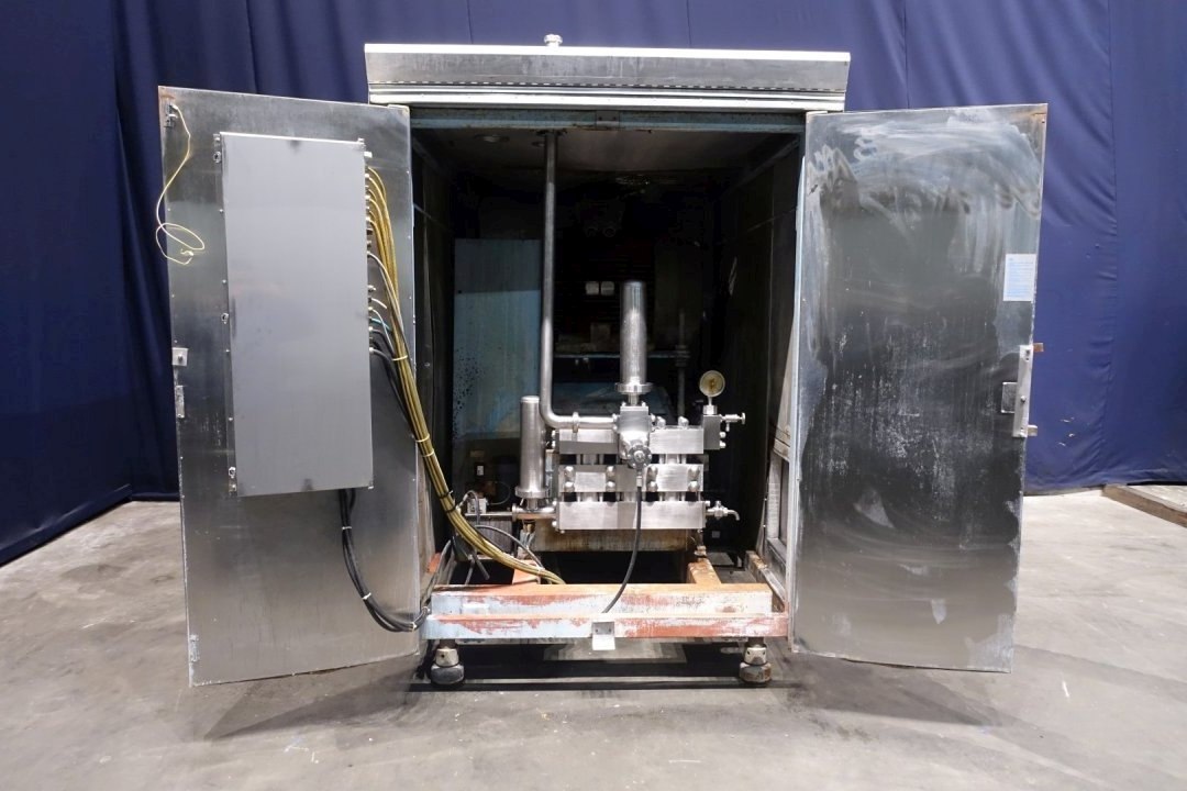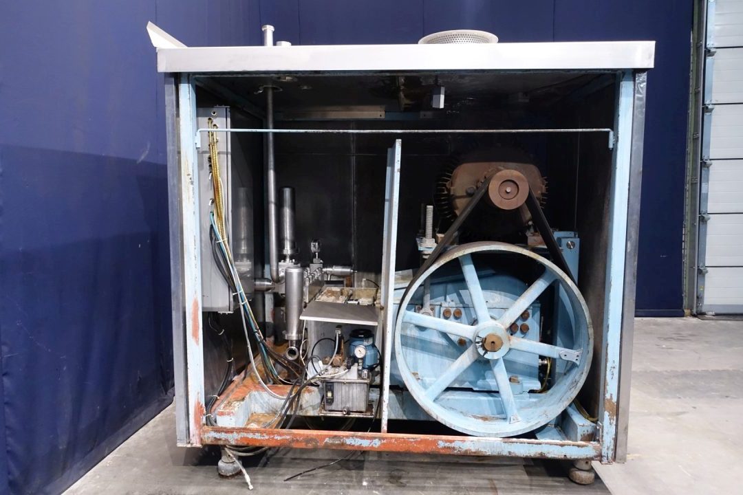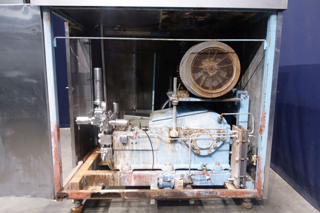High pressure homogeniser. 1 Stage with hydraulic pressure control (automatic regulation). 3 Pistons, piston diameter: 63 mm and stroke: 80 mm. Stainless steel cladded in sound-insulated cabinet <80dB (A) (Rannie Blue Top Milieu). Connections: 1 x 2" Din and 1 x 2" SMS. Current motor power: 110 kW - 209 A - 1.480 rpm - 50 Hz - 3x380 V. Maximum working pressure in current configuration with this motor 220 bar. Amount of cooling water, 200 l/h - lubricating oil 80 ltr - hydraulic oil 4 ltr. Fan for cooling of main motor is fitted on top of the cabinet. Control panel (no CPU or MCC). 1 x Pressure Manometer and 1 x drain tap. Flowswitch, circulation pump and external PHE on cooling water. Pulsation demper on inlet and outlet. Remote pressure control. Total dimensions: 230x160x250 (lxwxh) cm - weight: 3.910 kg. With operation manual and parts list.