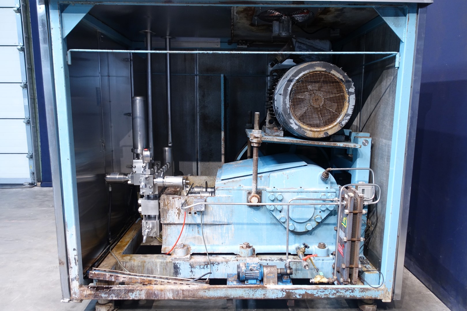 High pressure homogeniser. 1 Stage with hydraulic pressure control (automatic regulation). 3 Pistons, piston diameter: 63 mm and stroke: 80 mm. Stainless steel cladded in sound-insulated cabinet <80dB (A) (Rannie Blue Top Milieu). Connections: 2 x 2" Din. Current motor power: 90 kW - 166 A - 1.480 rpm - 50 Hz - 3x380 V. Maximum working pressure in current configuration with this 215 bar. Amount of cooling water, 200 l/h - lubricating oil 80 ltr - hydraulic oil 4 ltr. Fan for cooling of main motor is fitted on top of the cabinet. Integrated control panel no mcc or cpu. 1 x Pressure Manometer and 1 x drain tap. Circulation pump, flowswitch and external PHE on cooling water. Pulsation demper on inlet and outlet. Total dimensions: 230x162x248 (lxwxh) cm - weight: 3.650 kg. With operation manual and parts list.