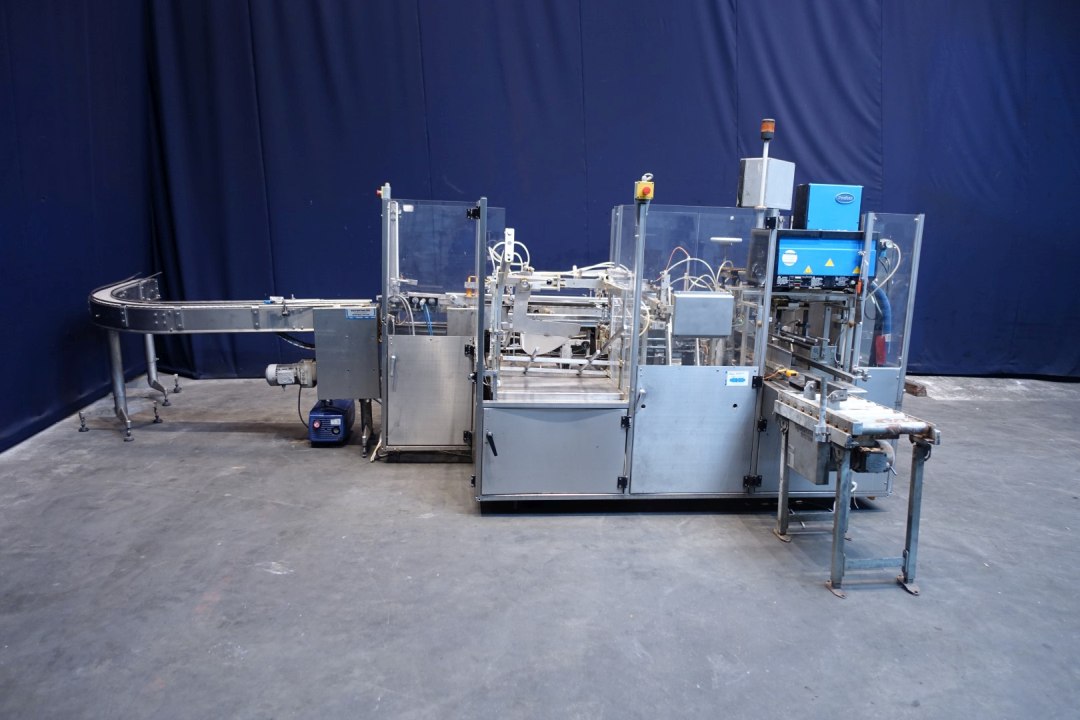 Fully automatic packer, to pack butter packs in an Carton type: American folding box. Operates fully automatically and all principal movements are mechanically driven. Used for 250gr bricks of foil 100 x 75 x 35 mm packed / and wrapped. Layout of the box 4x2x5 layers = 40 packs of 250 gram per carton = 10kg / carton. Nordson Microset Multiscan hotmelt glue unit with 3 hoses and 4 glue points. Controls Siemens S7 PLC. Total machine dimensions: 440 x 185 x 220 cm, weight: 2.051 kg's. Also available in complete line with SIG packer (STN15438), interconnecting conveyors and metal detector (STN15450).