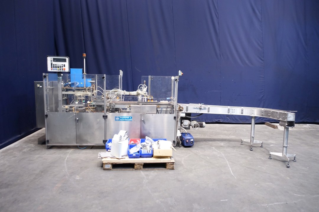 Fully automatic packer, to pack butter packs in an Carton type: American folding box. Operates fully automatically and all principal movements are mechanically driven. Used for 250gr bricks of foil 100 x 75 x 35 mm packed / and wrapped. Layout of the box 4x2x5 layers = 40 packs of 250 gram per carton = 10kg / carton. Nordson Microset Multiscan hotmelt glue unit with 3 hoses and 4 glue points. Controls Siemens S7 PLC. Total machine dimensions: 440 x 185 x 220 cm, weight: 2.051 kg's. Also available in complete line with SIG packer (STN15438), interconnecting conveyors and metal detector (STN15450).