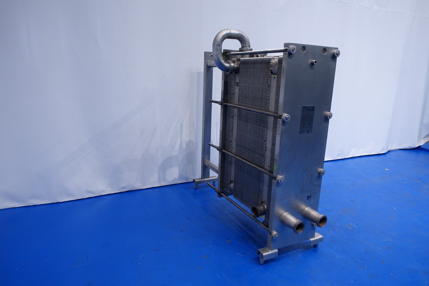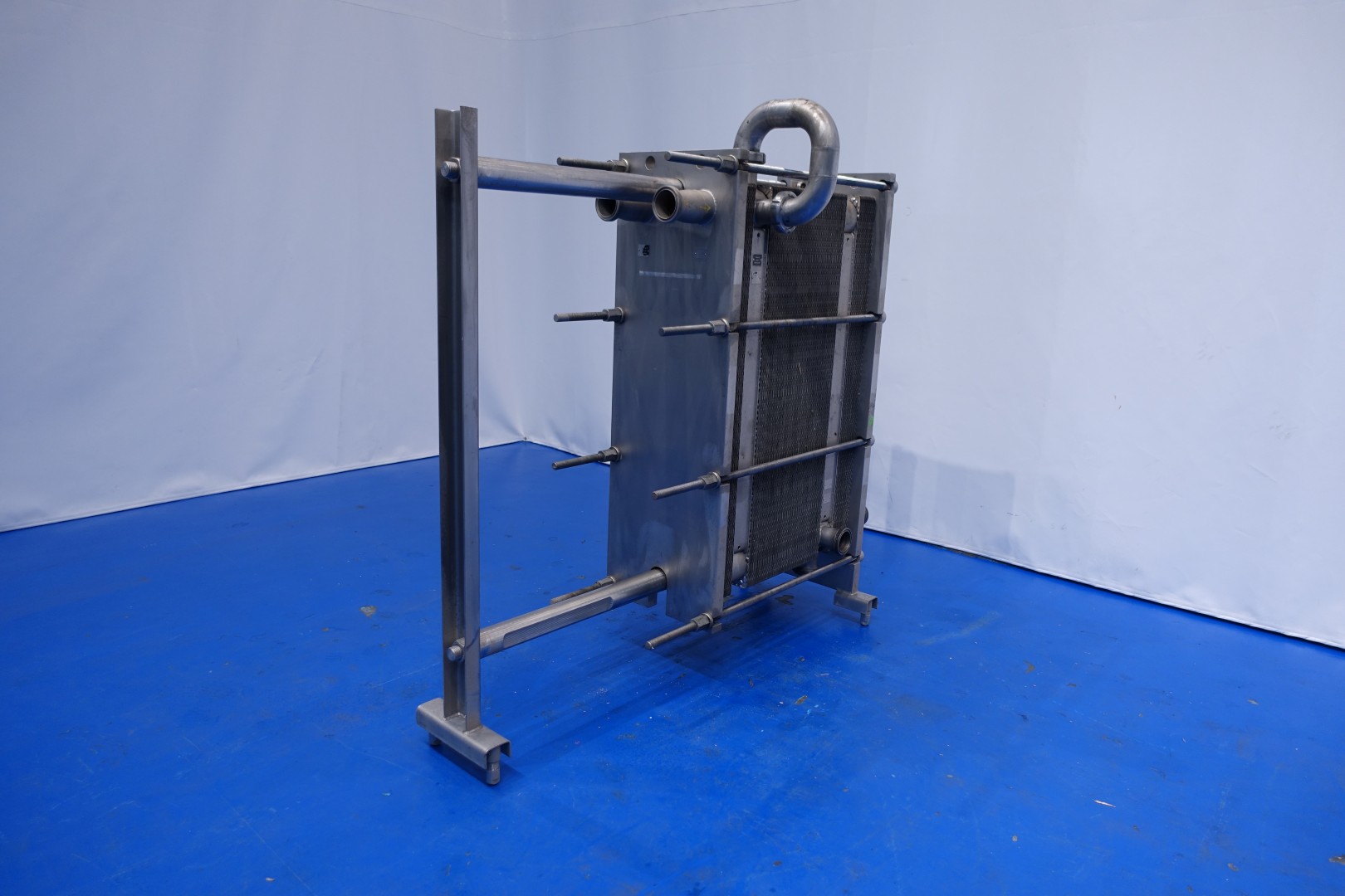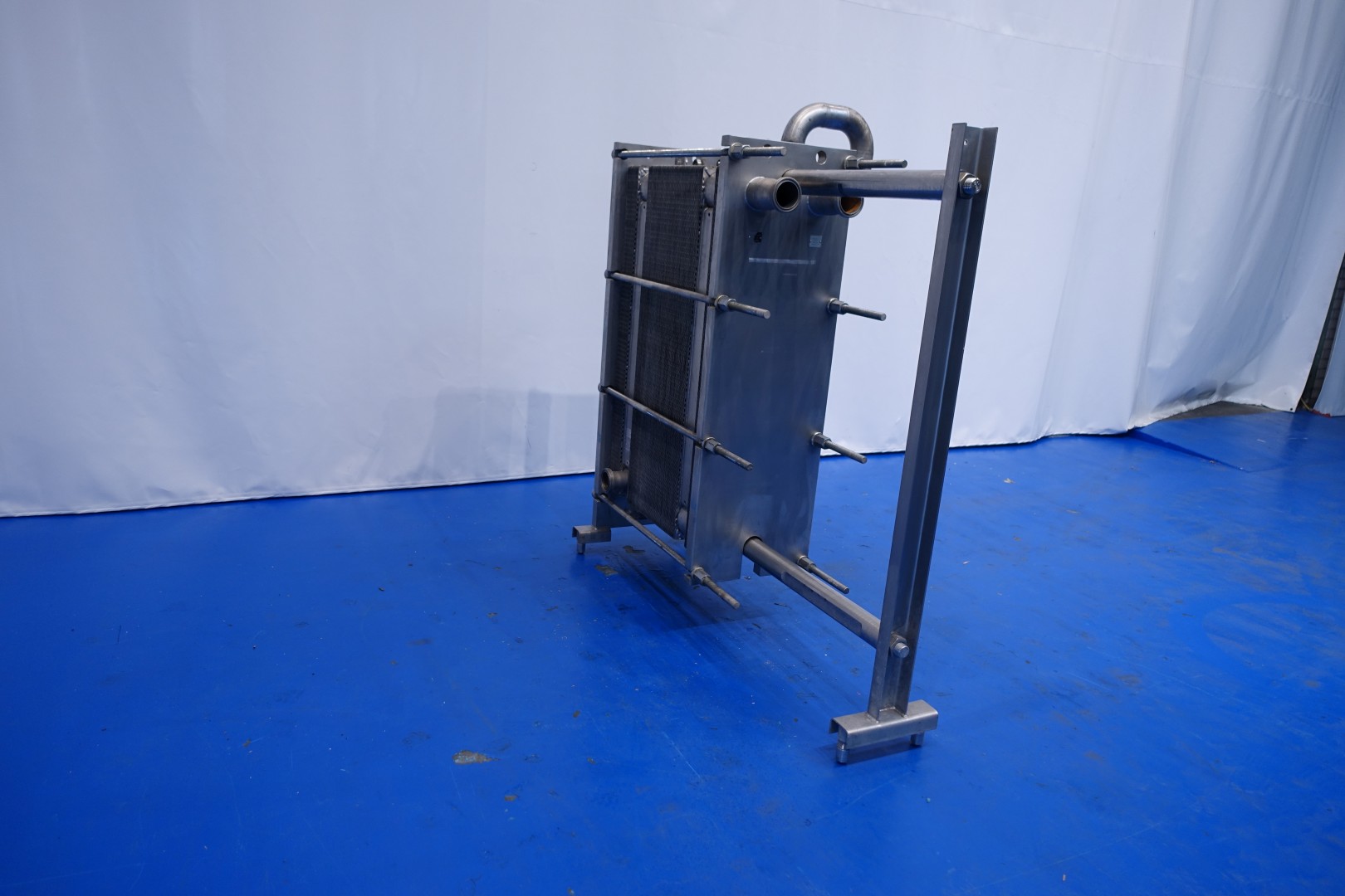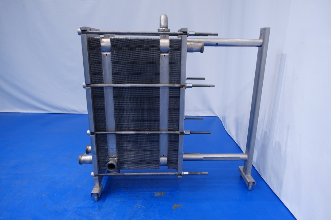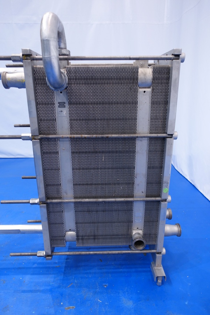 Plate heat exchanger, sanitary (PHE). Pressure: 10,0 bar. Beam length: 150cm, connections: 9x 3" SMS. Current configuration: 3 Sections: 22-91-22 plates (total 135 plates). Connections head: 2 up, follower 2 up. Heating/cooling surface 0,44 m2 per plate in total 59,3 m2. Total dimensions: 175x174x60 (lxwxh) cm - weight: 1.044 kg.