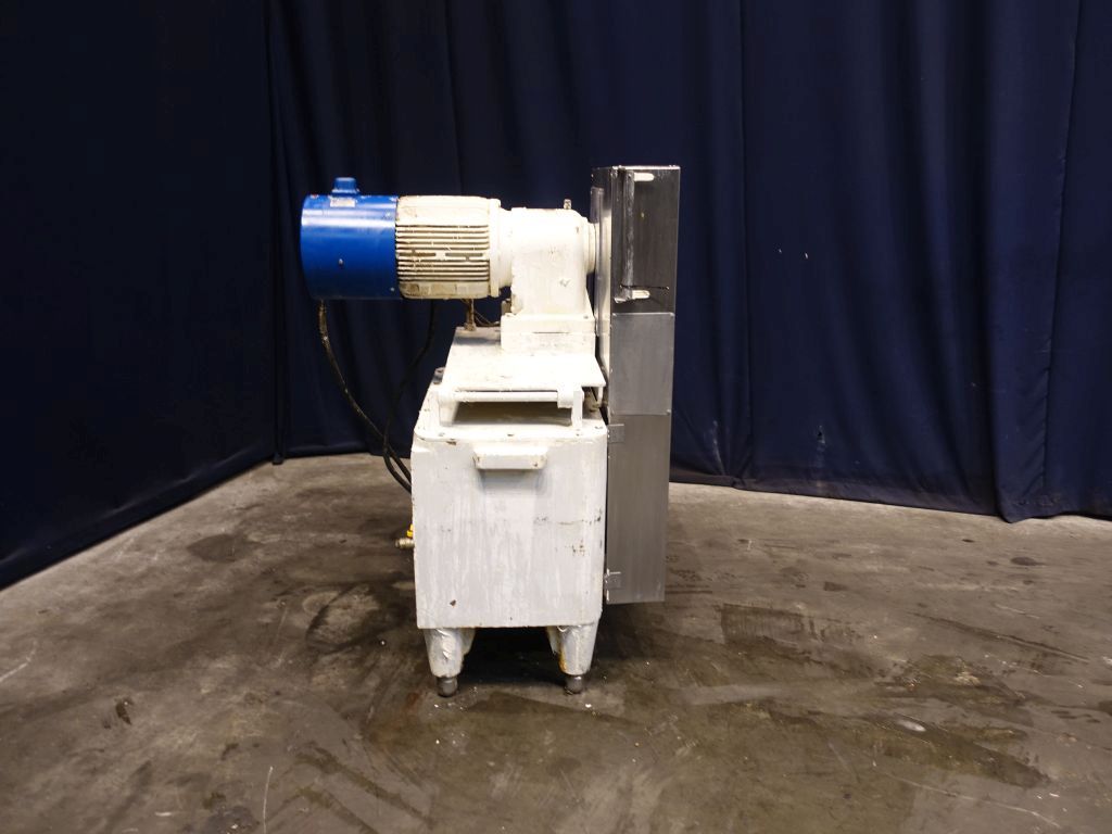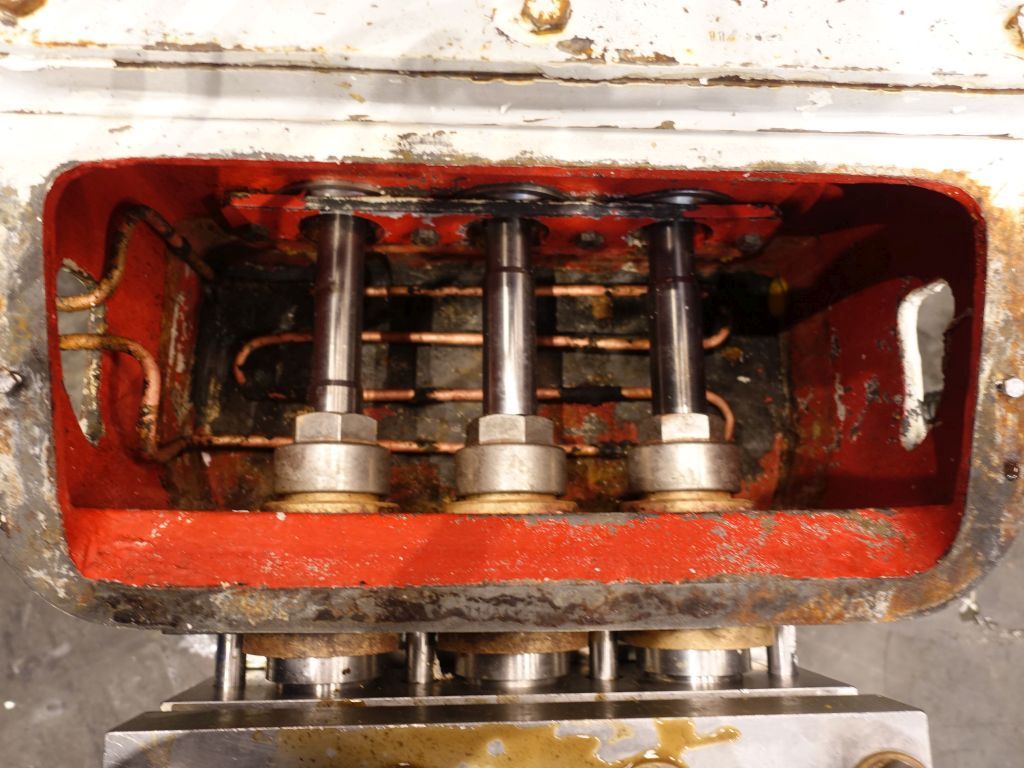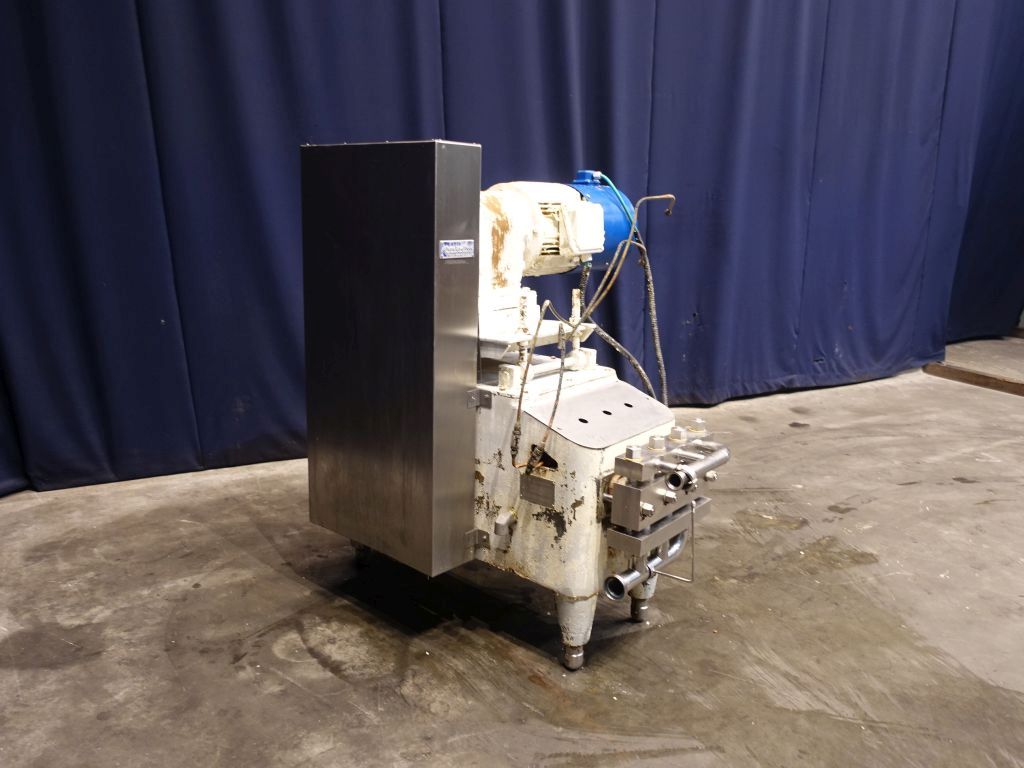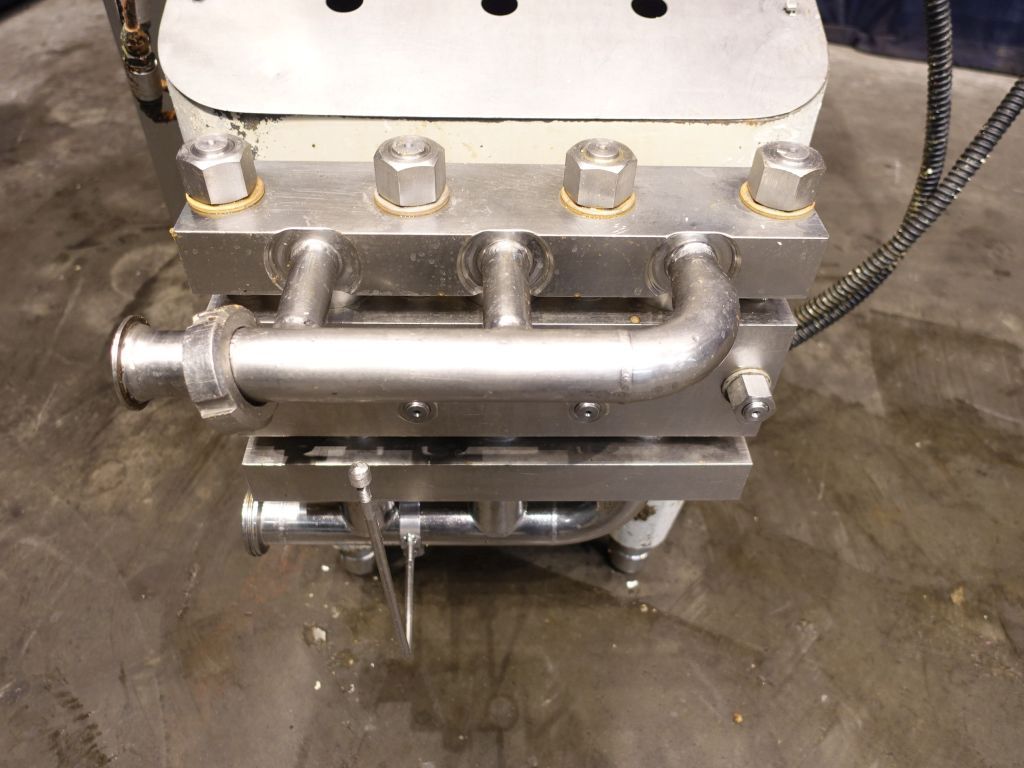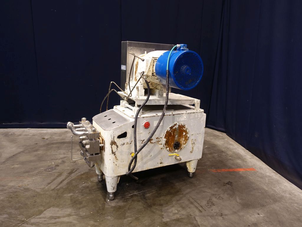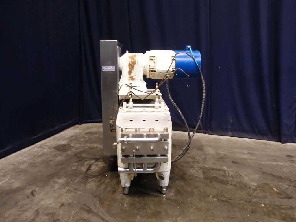 High pressure pump used for margarine (delivered by Tetra Laval Food, but original supplier Schroder). The conveying pump is a 3 piston pump with 3 suction and pressure valves. It conveys the margarine emulsion coming from the premix / buffer vessel at a pressure of 10 - 50 bar overpressure (table margarine) or 30 - 70 bar overpressure (pastry margarine) into and through the cooling cylinders of the crystalliser. Piston diameter: 40 mm and stroke: 105 mm. Motor: 15 kW (estimated, no type shield), forced cooling on the motor to be able to run on low speed with a frequency converter. Connections: 2''/1,5'', DIN. Total dimensions: 110 x 140 x 140 cm.
