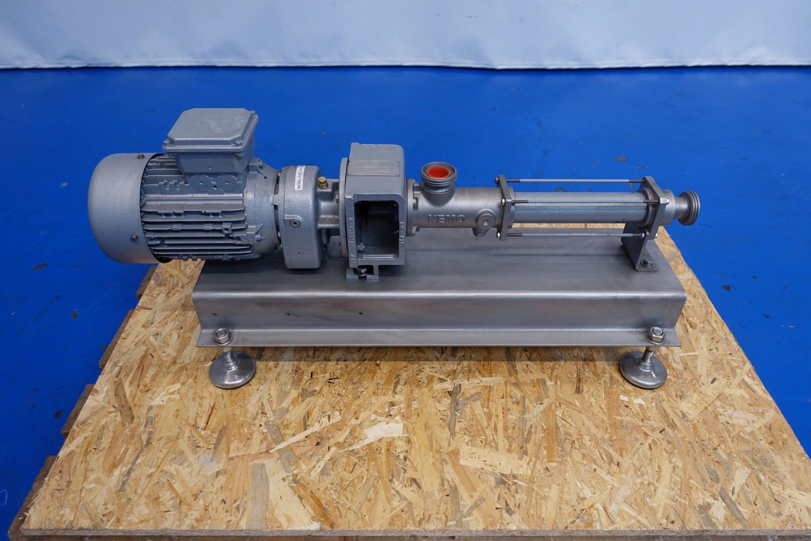 Already reconditioned Nemo mono pump / progressing cavity pump. Komm. Nr. order no.: 63005406. Speed: 256/560 rpm. Prod. temp. 20/30°C. Motor: 1,5 kW - 3,6 A - 1.395 rpm - 50 Hz. Nord gearbox, output speed: 368 rpm. Frame mounted with adjustable feet. Connections in: 1,5" Din - out 1,5" Din. Dimensions: 93x32x42 (lxwxh) cm - weight: 76 kg.