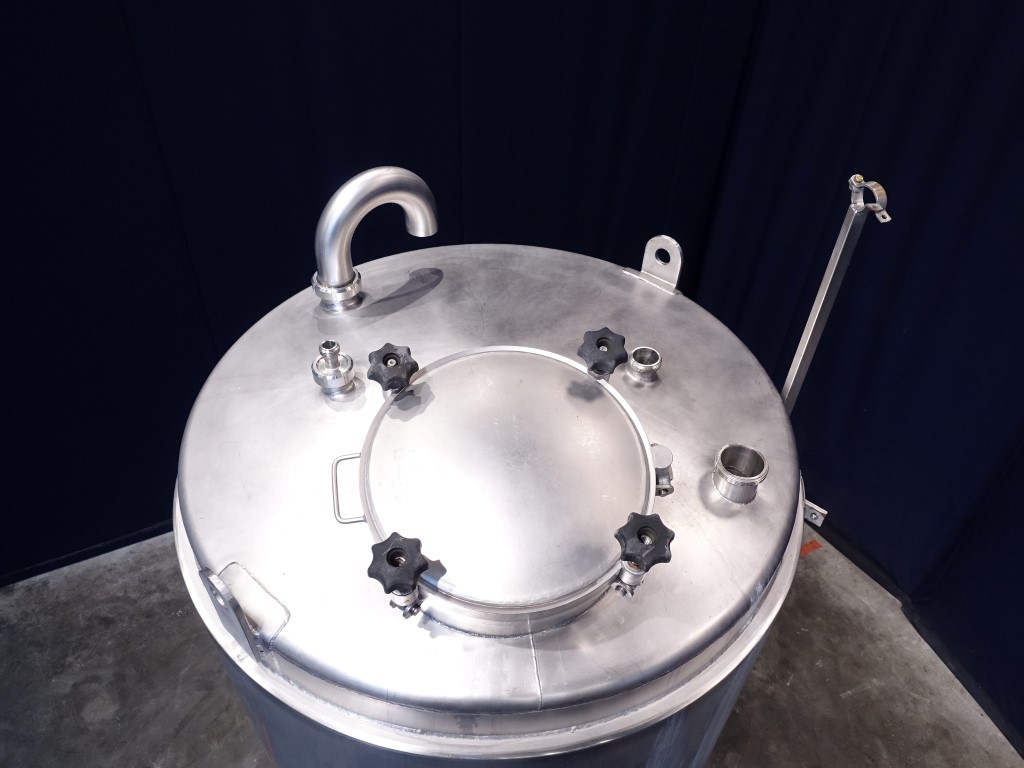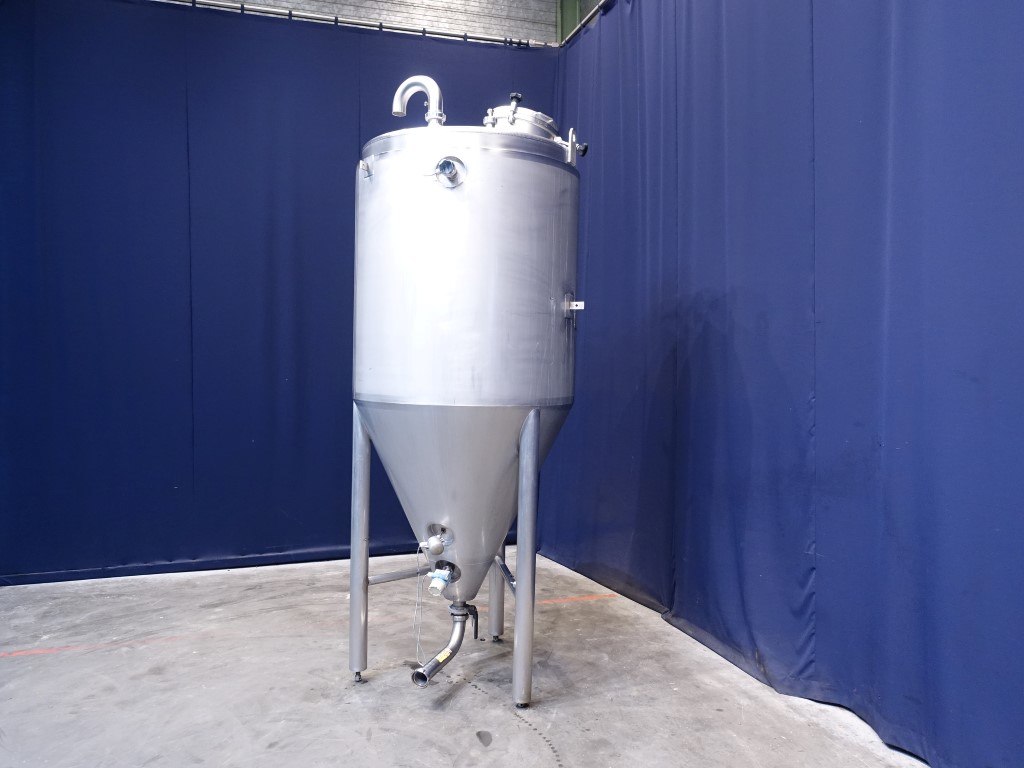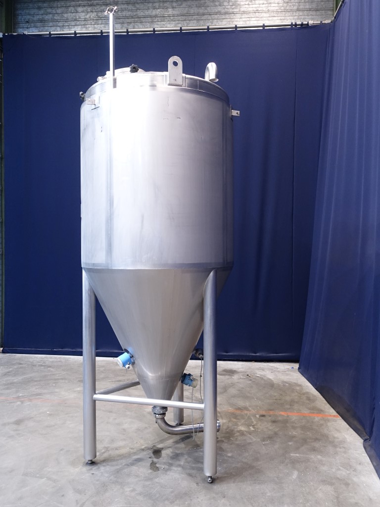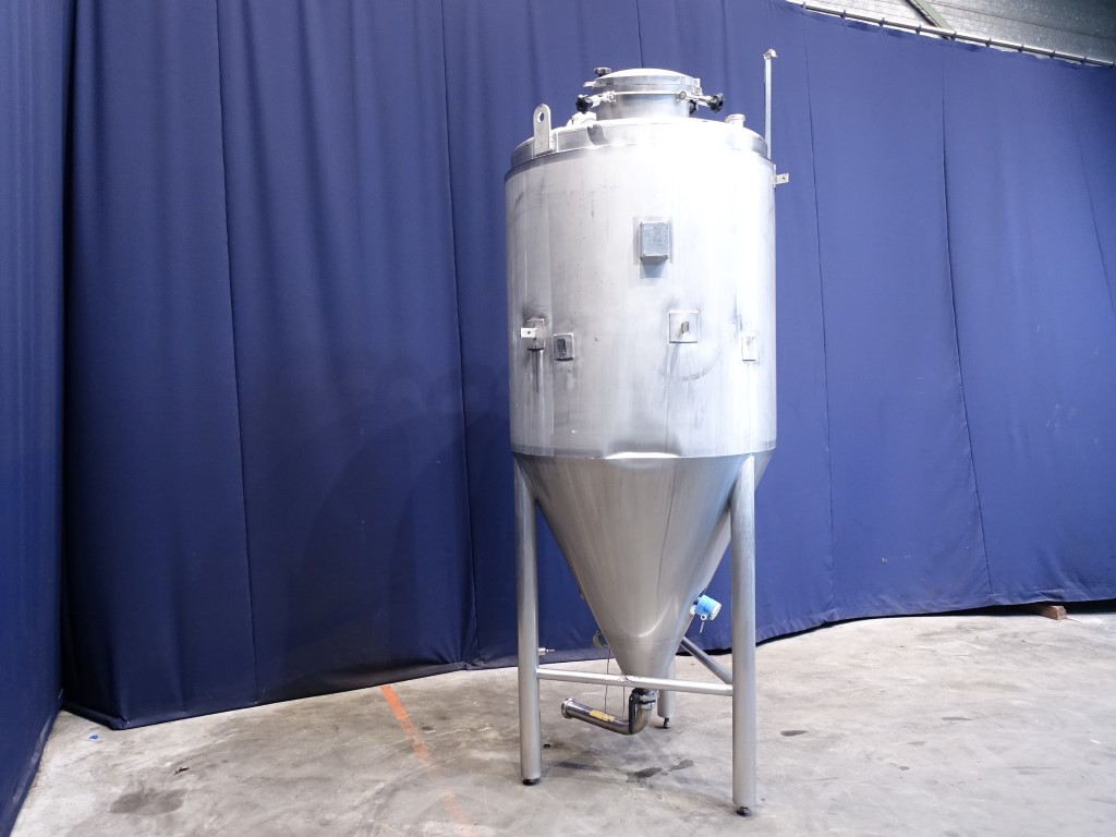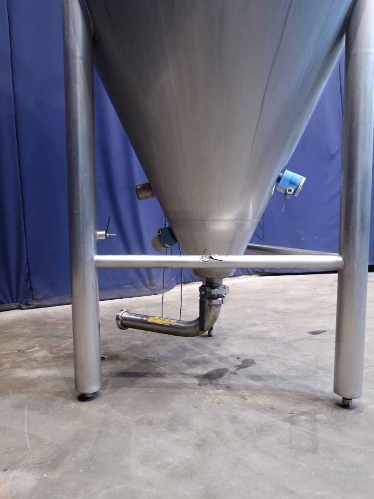 Siersema Vertical tank, insulated side and bottom, pressure in tank atmospherique. Conical bottom, product Outlet, 3'' SMS, outlet height: 18 cm. With manual butterfly valve, connnections for: pt-100 temp sensor, pressure transmitter, high and low level, breather, 1 cip spray bowl, manhole in top round diameter 400 mm. 3 adjustable feet, innner dimensions of tank diameter 120 cm height 250 cm, total dimensions: 135 x 135 x 350 cm.