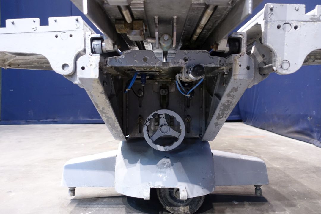 Semi automatic bulk packer. Packaging of butter in blocks of 5 to 25 kg. Cardboard box filling. Manual weight adjustment. Direct infeed via hopper. With roller wheels to side, side rolling table. Total dimensions: 180 x 95 x 124 cm.