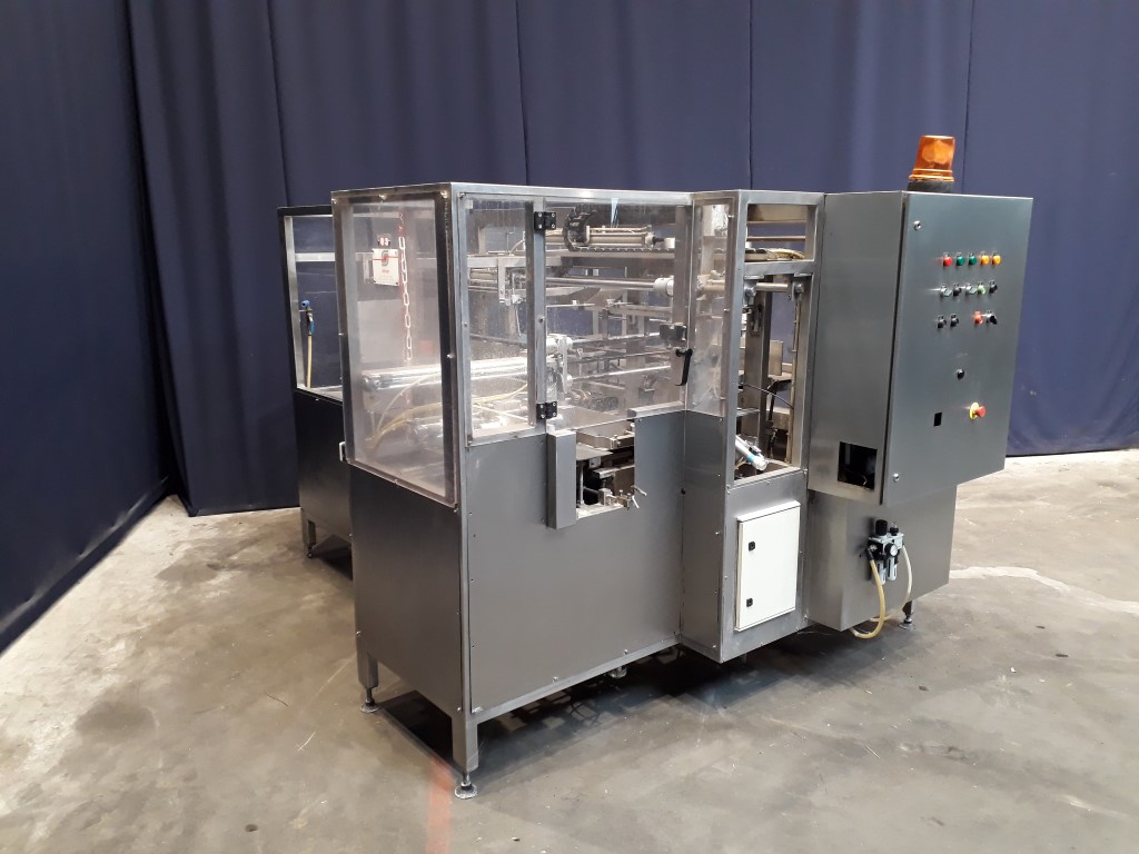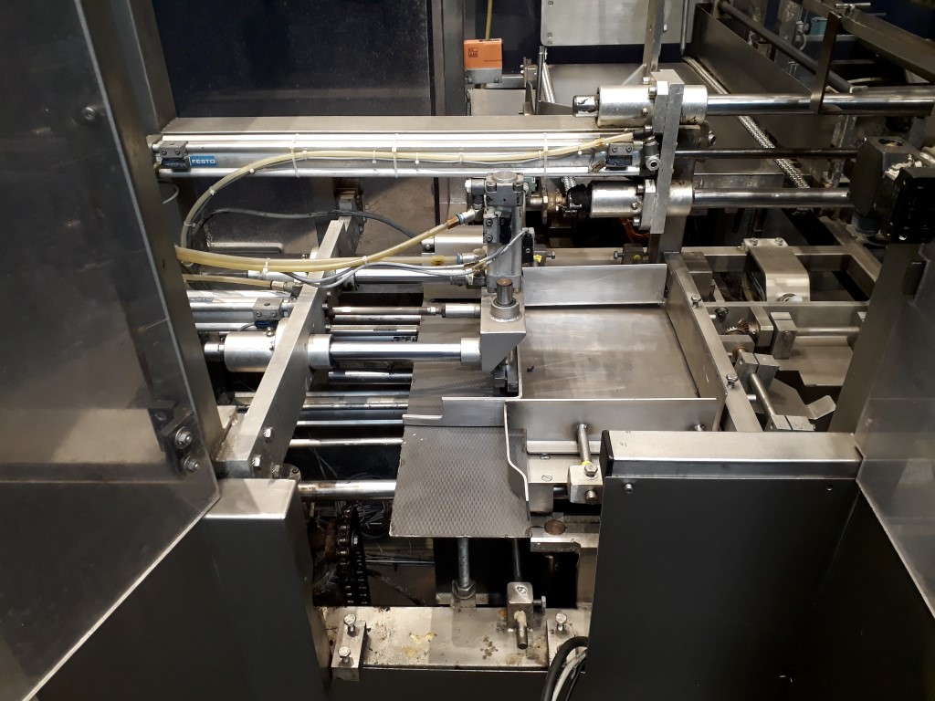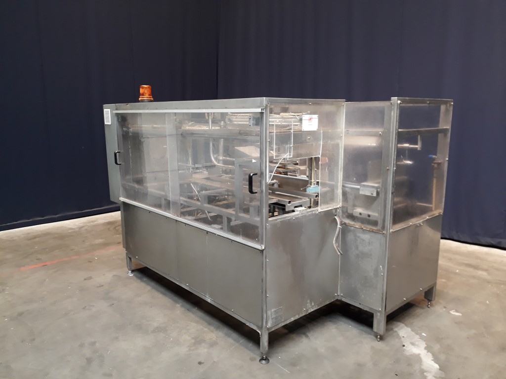 Fully automatic case packer for butter packages in a carton box. Currently set for 250 gram packages of 108 x 63 x 39 mm, pack scheme 5x2x4 = 40 packages of 250 gram in 1 box (10 kg per box). Type of cartons: American folding box. Including infeed and outfeed conveyor. Spare parts manual and electric scheme available. Had been running together with a SIG FD140, STN12176.