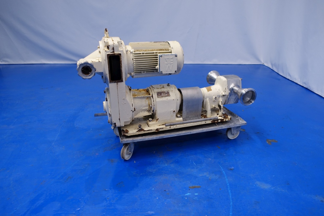 Single lobe pump for butter trolley STN15691, Oscillating displacement pump. Diameter lobbe: 130 mm. Displacement per revolution: ltr. Nominal capacity m3/h. Current drive work: motor: 3,0 kW - 7,4 A - 940 rpm. Variable speed by mechanical variator/reductor. Mounted on plate with wheels. Connections: (in) 4" SMS / (out) 4" SMS. Total dimensions: 120x50x81 (lxwxh) cm - weight: 274 kg.