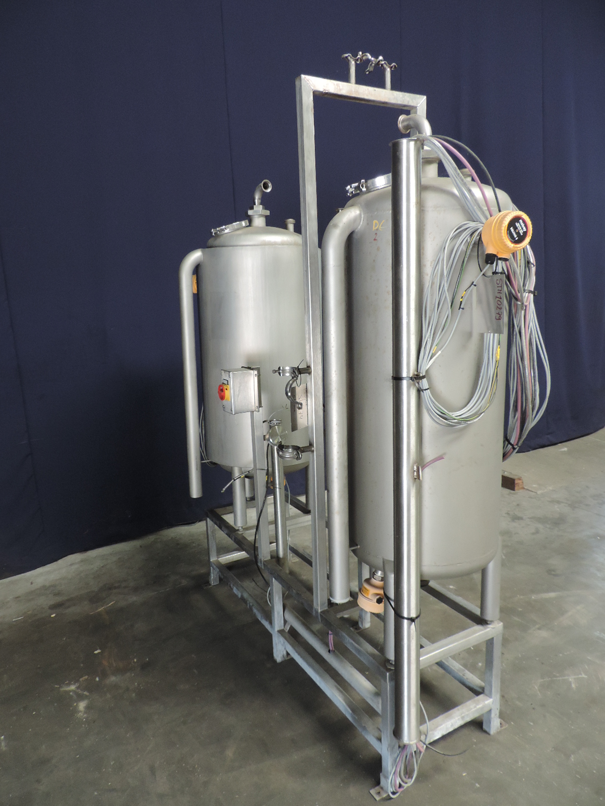 Skid with 2 tanks, one tank with steam heated jacked the other tank is single jacked. Inside dimensions tanks: Ø 500 mm and height 1000 mm.