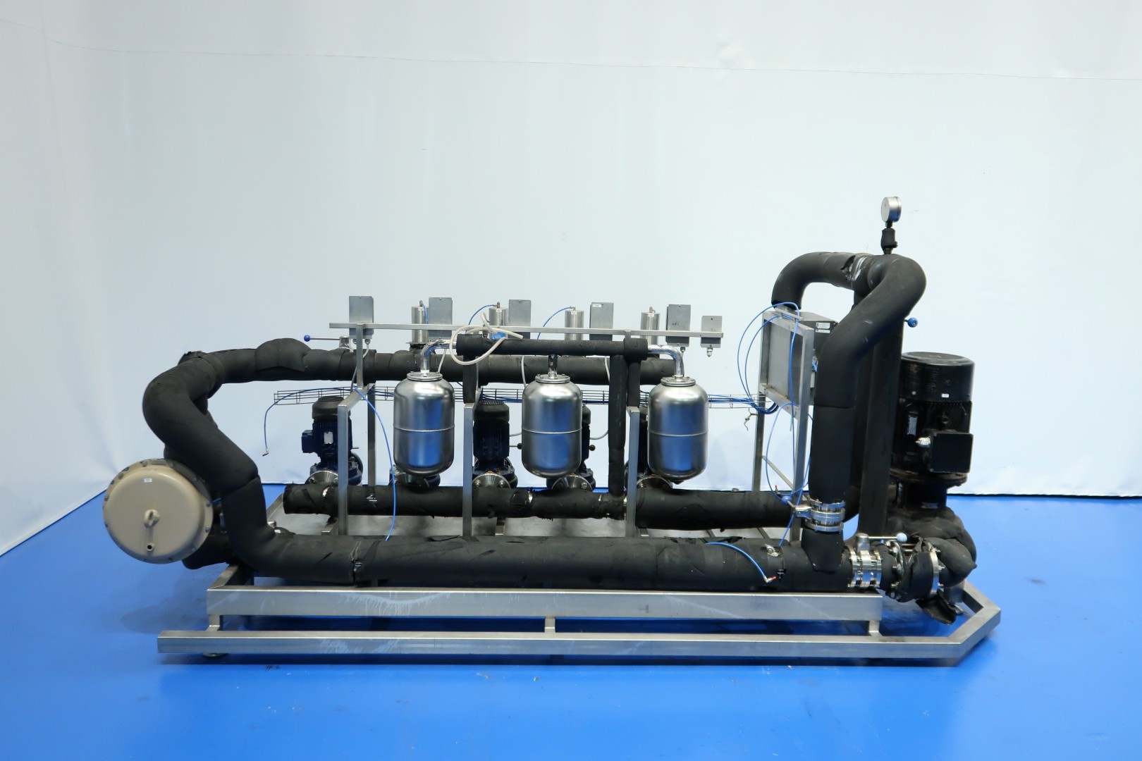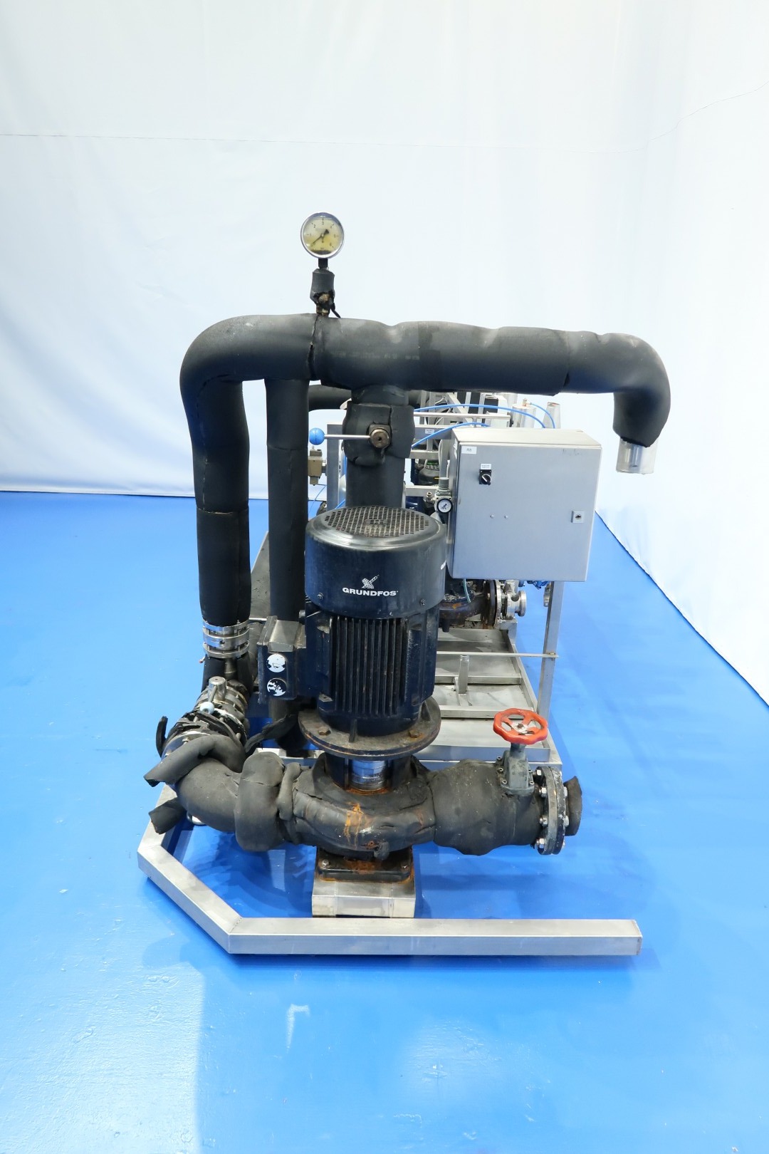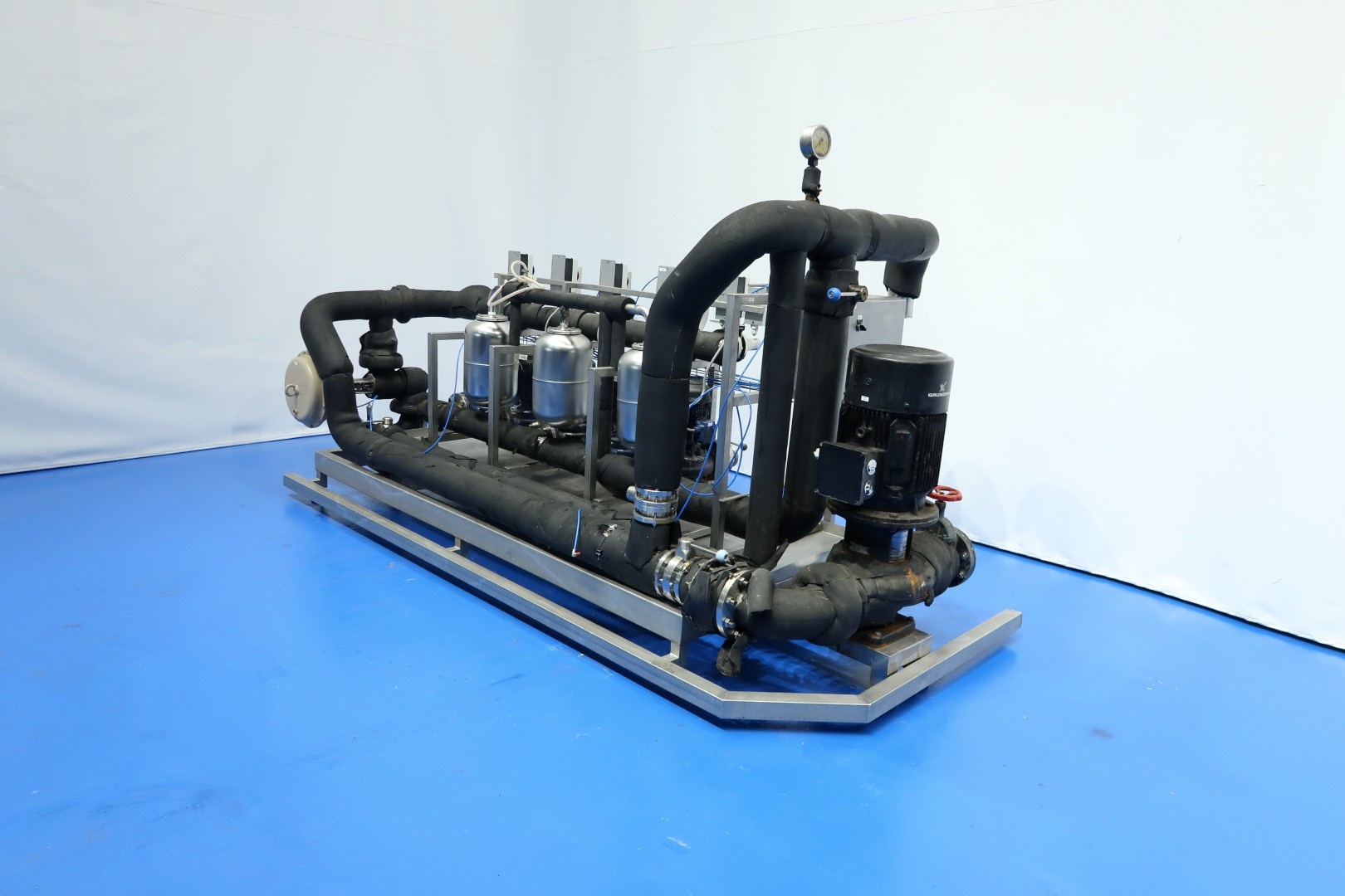 Circulation pump set built on SS frame with leakage plate and adjustable feet. Consists out of 5 x Smedegard Omega 6-140-2 non sanitary pumps (3,0 kW - 6,5 A - 2.810 rpm - 50 Hz) and 1 x Grundfoss pump (15 kW - 2.940 rpm). With butterfly valves - Samson valve, Pressure manometer and 3 x SS pressure vessel. Previously used as glycol pump-set. Total dimensions: 348x130x173 (lxwxh) cm - weight: 980 kg.