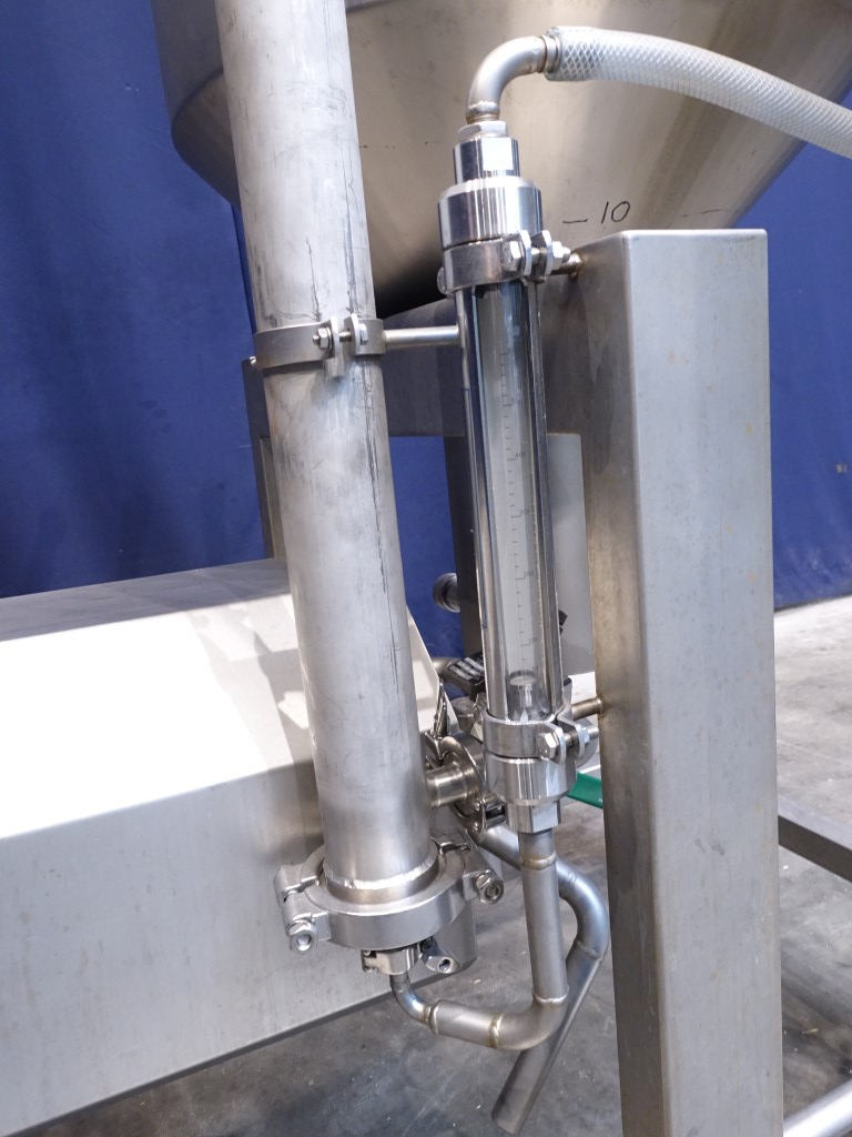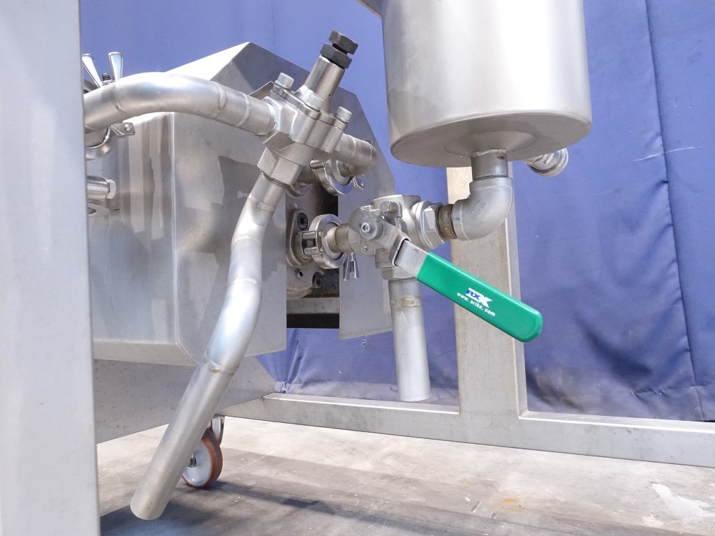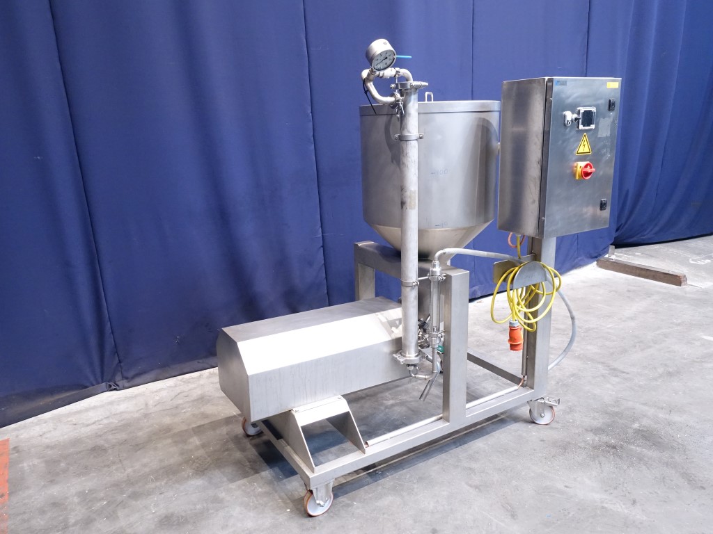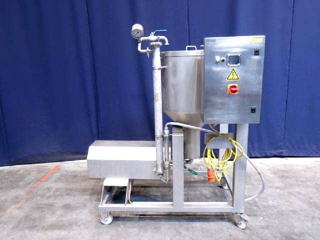 Pilot filtration unit up to 50bar. 1 Filter section Filter housing : typ: 2540 pressure vessel for Filter elementes MF-UF or RO dia 25"/ 40", 62mm - 1.016mm Dimensions. Double jacketed balance tank with cover (Geurtsen, type 51416, serial nr 2071642, 2007, volume 150 ltr), feedpump (Hydra-Cell pump, G10XKSESFEMD-M2M, 316L stainless steel head, EPDM diaphragm & O-ring material, 316L stainless steel valve seat material, stainless steel valve material, Elgiloy valve springs, PVDF valve spring retainers, serial nr 206822, motor 4 kW - 1.440 rpm, max pressure 50 bar, 120-1.470 ltr/h), 1 recirculation loops through filter and balance tank, 1 Flow indicator. Control panel with start/stop and potential meter to control the pump. 1 Frequentz converter. Mobile mounted on a stainless steel frame. Total dimensions: 120 x 160 x 190 cm.