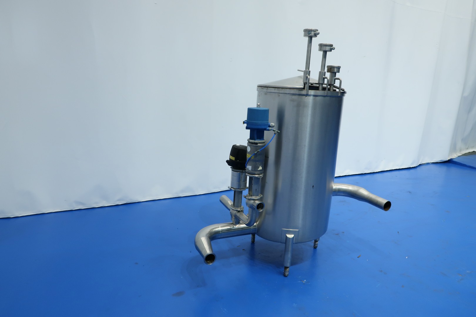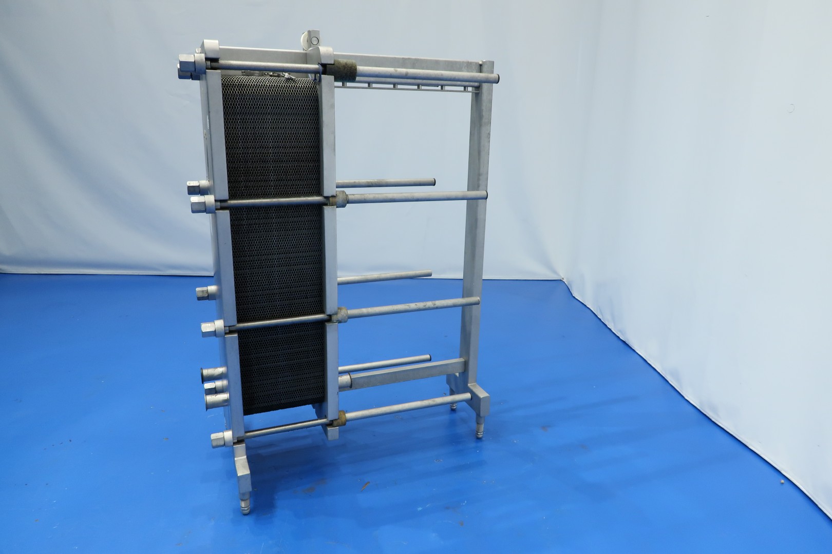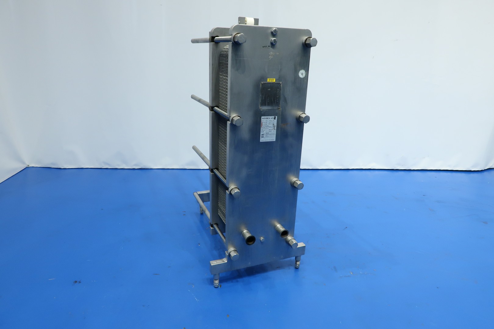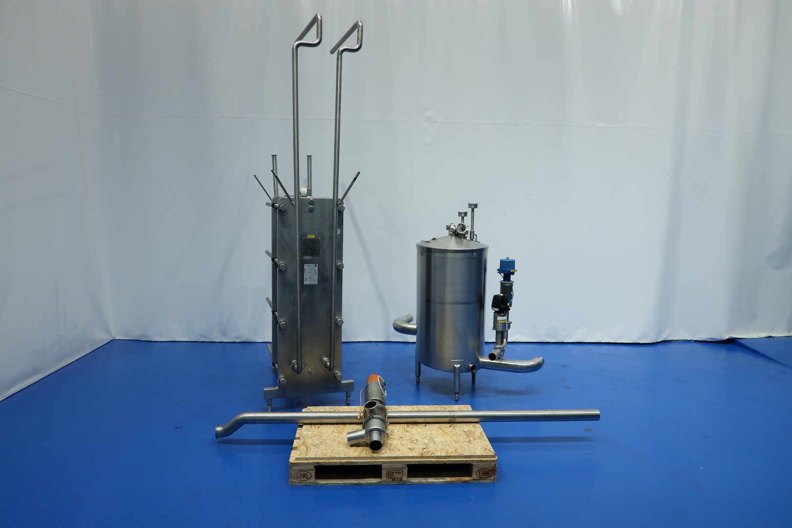 Plate heat exchanger, (PHE). Max working pressure: 10 bar - max working temperature: 110 °C. Beam length: 100 cm, connections: 4 x 2" Tryclamp. Current configuration: 1 Section; 77 plates. Connections head: 2 down, follower 2 down. With balance vessel (ca. 250 ltr.) with level sensors, valves and piping. Originally used as cream cooler ± 55 -> 4°C at 3,000ltr/h but can also be used for other liquid products with different flow/temperatures capacity 149kW. Dimensions PHE: 117x70x168 (lxwxh) cm - weight: 742 kg.