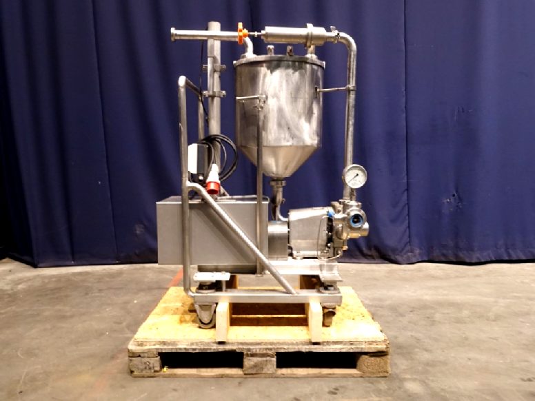 Lobbe pump with tri stainless steel lobbes. Diameter lobbes: 98 mm. Displacement per revolution: 0,266 ltr. Current drive work: motor: 1,1 kW - 2,6 A - n1: 1410 rpm, n2: 80 - 400 rpm. Max speed: 1.000 rpm. Variable speed by mechanical variator. Stainless steel cover over electric motor. Design pressure up to 10 bar in newcondition. Over pressure valve. Mounted with 3 load (weighing) cells on a mobile frame with hopper (50 ltr). Connections: DN40, SMS.