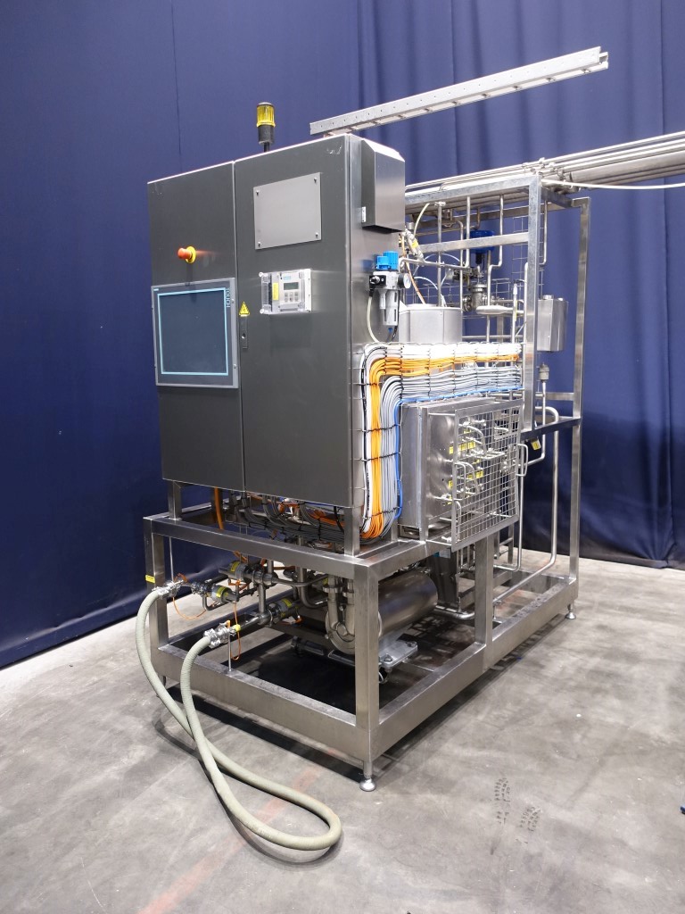 Pilot plant line 2 stage UF plant used for the NDC process. Incoming raw material: Milk, MCI 80, cream etc. Line existing out of : 1) Skid mounted pretreatment pasteurisation unit, 200 ltr/h @ 70/100°C (Fristam FZ15 self-priming pump for emptying feed IBC tank, 1.000 ltr/h, balance tank, BamInox, 50 ltr, Jung Hyghspin double screw product feed pump of 200 ltr/h @ 4 bar, GEA Ecoflex VT04 plate heat exchanger with 6 sections, temperature cycles adjustable: in 5°C - 50/55° - 70/100°C - various holding tubes in insulated box 10/15/30''- 68/98°C - 50/55°C - 6°C, indirect hotwater system with steam, cooling with city and icewater, 2 Grundfos centrifugal waterpumps, unit has its own control panel with frequency convertors, Siemens S7 PLC and Siemens touch screen, dimensions: 140 x 220 x 280 cm). 2) Dosing unit with 4 dosing pumps mounted on a mobile frame with table (Prominent Delta, 1608NPE, dosing rate of each pump: 7,8 l/h, 16 bar, unit has its own control panel with Siemens S7 PLC and Siemens touch screen, dimensions: 140 x 220 x 220 cm). 3) Ultrafiltration unit with an outfeed of 3-40 ltr/h, 2 stages (balance tank 500 ltr with agitator, feed pump of 960 ltr/h @ 4 bar, plate heat exchanger, preheater with 2 sections, 5°C - 60 °C, UF1, PF plate and frame filter system with plate filter, CONSEP Filter Module, Membrane Type: 10kda PES, max 20 m2, Jung Hyghspin 90 twin/double screw circulation pump 49 m3/h @ 10 bar, UF2, plate and frame filter, CONSEP Filter Module, Membrane Type: 10kda PES, max 10 m2, UF1 and UF2 could run each only or in series, Jung Hyghspin 90 double /twin screw pump 32 m3/h @ 8 bar, 2 Alfa Laval centrifugal pumps, Grundfos centrifugal pump, Lobbe pump, 3 tubular heat exchangers in which 2 for product and 1 for water, unit has its own control panel with Siemens S7 PLC and Siemens touch screen, dimensions: 480 x 220 x 280 cm). Flowschemes and electric schemes of the line available.