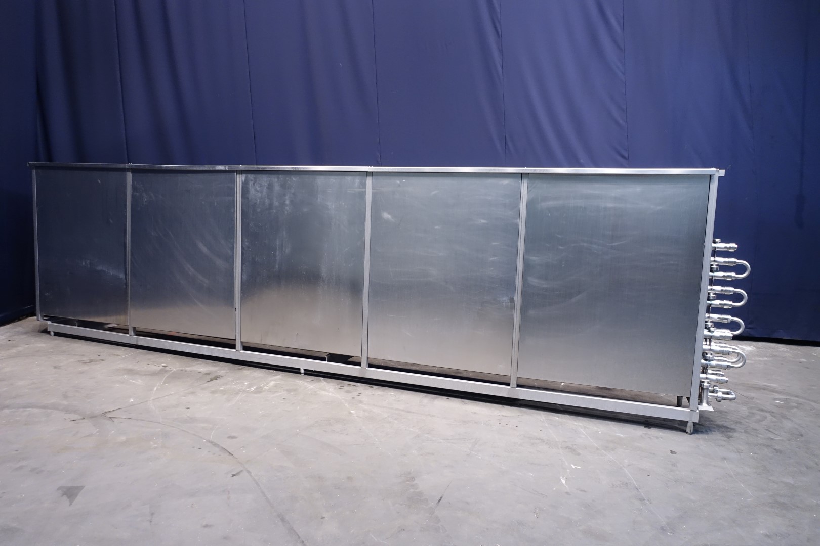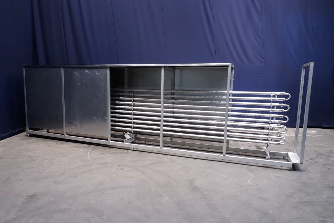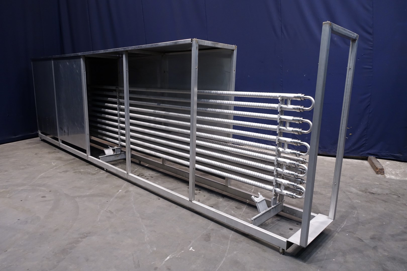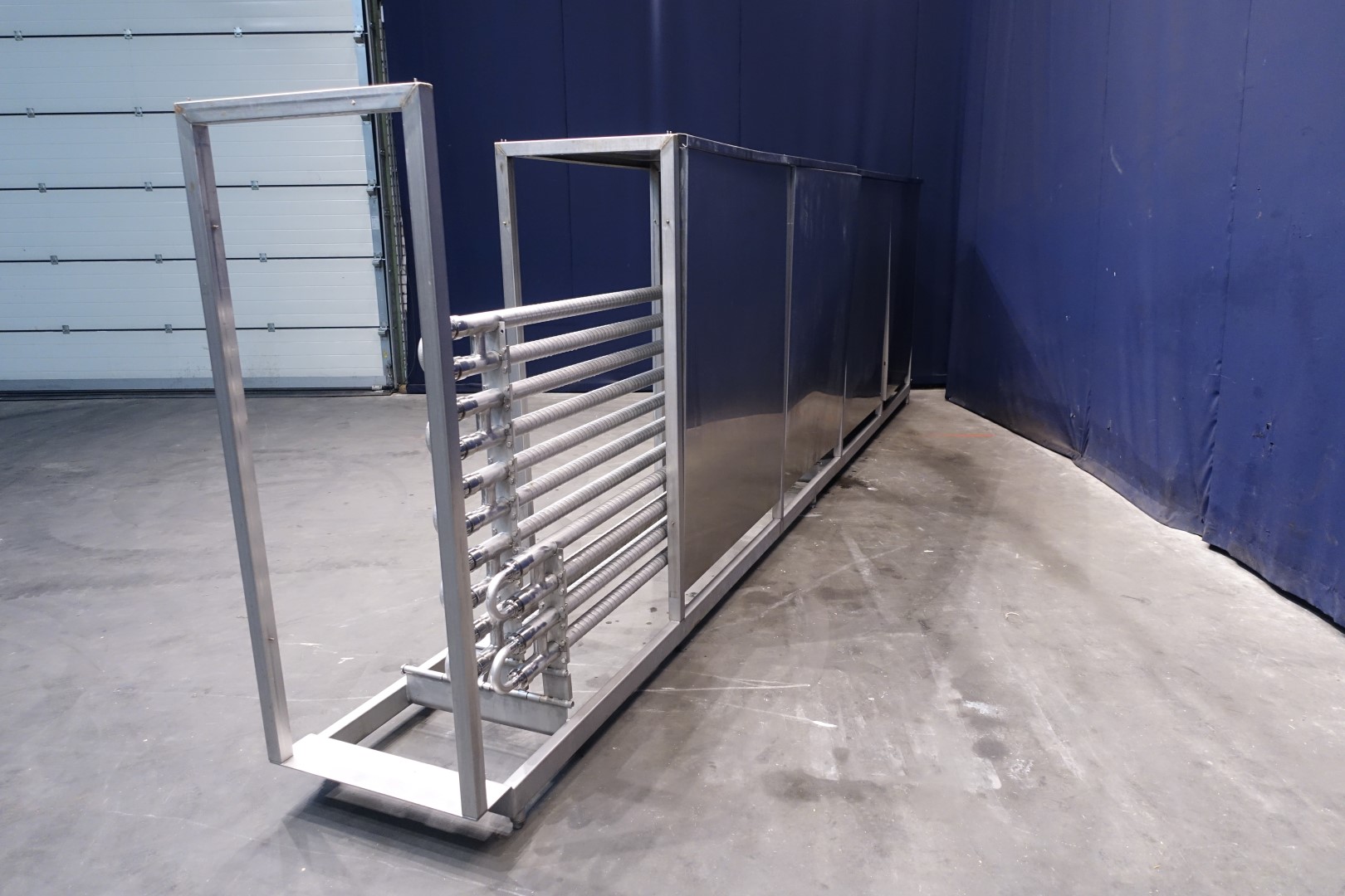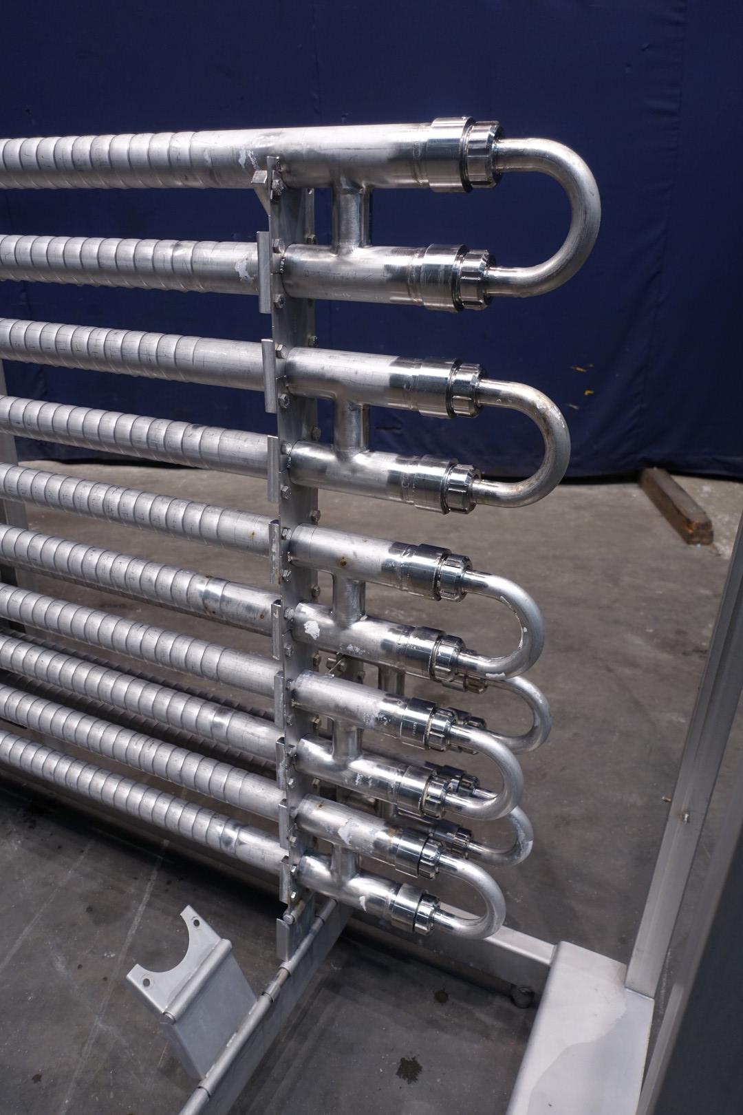 Tubular heat exchanging unit. Existing out of: 14 tubes (7 sets of 2), multitube, straight design, 1 section, length: 6 mtr, outer diameter 54 mm coagurated (spiral wound), 4 inner tubes of diameter 16 mm, smooth, connection: product: 1,5'' SMS, service: 1,5'' SMS and bends (2 bends missing). All mounted in 1 stainless steel frame. Total dimensions: 645 x 69 x 180 cm.