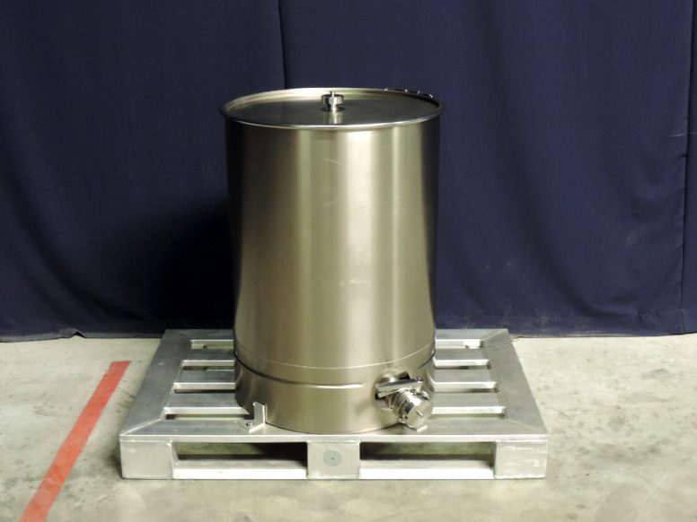 Stainless steel vessel: cap with seal and butterfly valve on aluminium pallet. Inner dimensions: Ø 60 cm, height 70 cm. Outlet connection: 2" DIN11851.