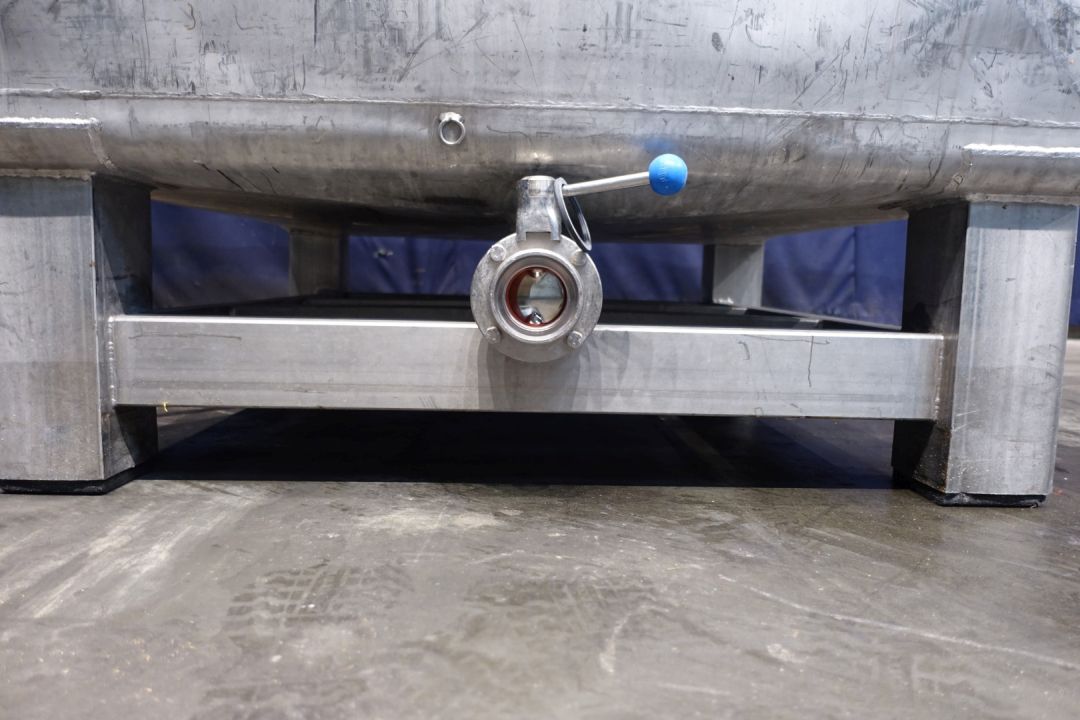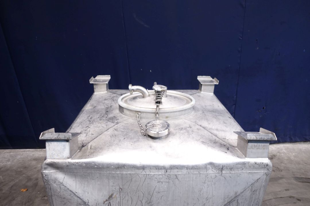 Square stackable transport tank, single jacketed. Product outlet 2" Din with manual butterfly valve and outlet height: 19 cm. Conical bottom to outlet. Product inlet on top, connection: 2,5" Din. 1 CIP spray bowl in manhole cover. Manhole in top/side, oval 44 x 30 cm. 4 Feet, SS transportframe. Inside dimensions of tank: lxbxh 105 x 105 x 105 cm. Total dimensions: 105 x 105 x 155 cm, Weigth 138 kg. Has some dents - signs of use.