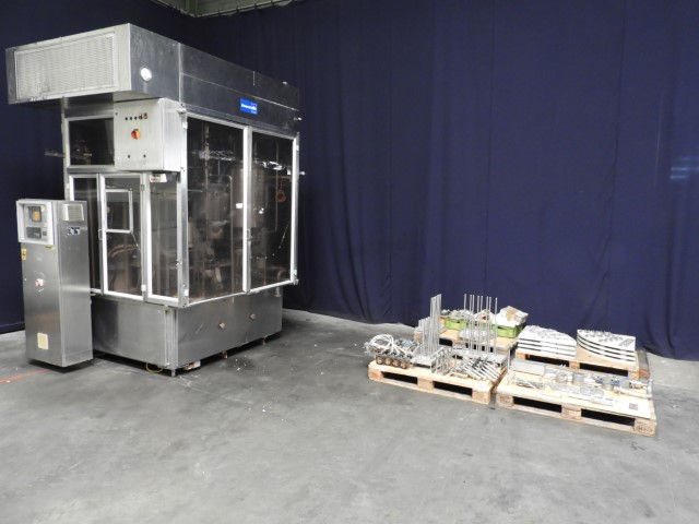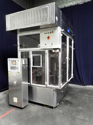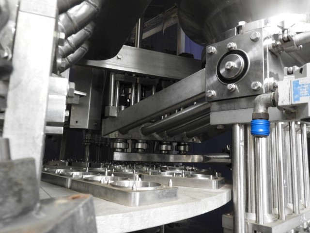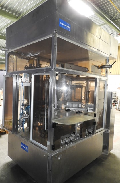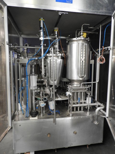 Rotatry filler with 4 Heads. 3 Formats: cup size round: 68 mm and 71 mm and 'duo cup' 2x 70 mm. Stations: cup destacking, no cup detection by photocell, main piston doser (100 - 250 ml) with cup lift and insulated hopper for hotfill (CIP cleanable), after doser for a topping with insulated hopper (CIP cleanable), used on dessert products, seal dispending by vacuum, heat sealing, date coder by embossing ink. Outfeed conveyor missing. Machine has plexiglas safety guards. Machine is in clean configuration with a hepa sterile air system. Easy format change (turn table in 4 parts). Controls: Telemecanique, model: TSX47 and cam corder HMI. Documentation available. Total outer dimensions lxwxh: 240 x 220 x 310 cm.