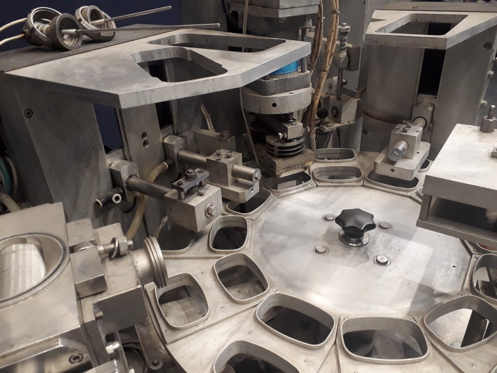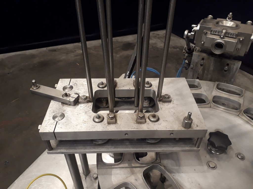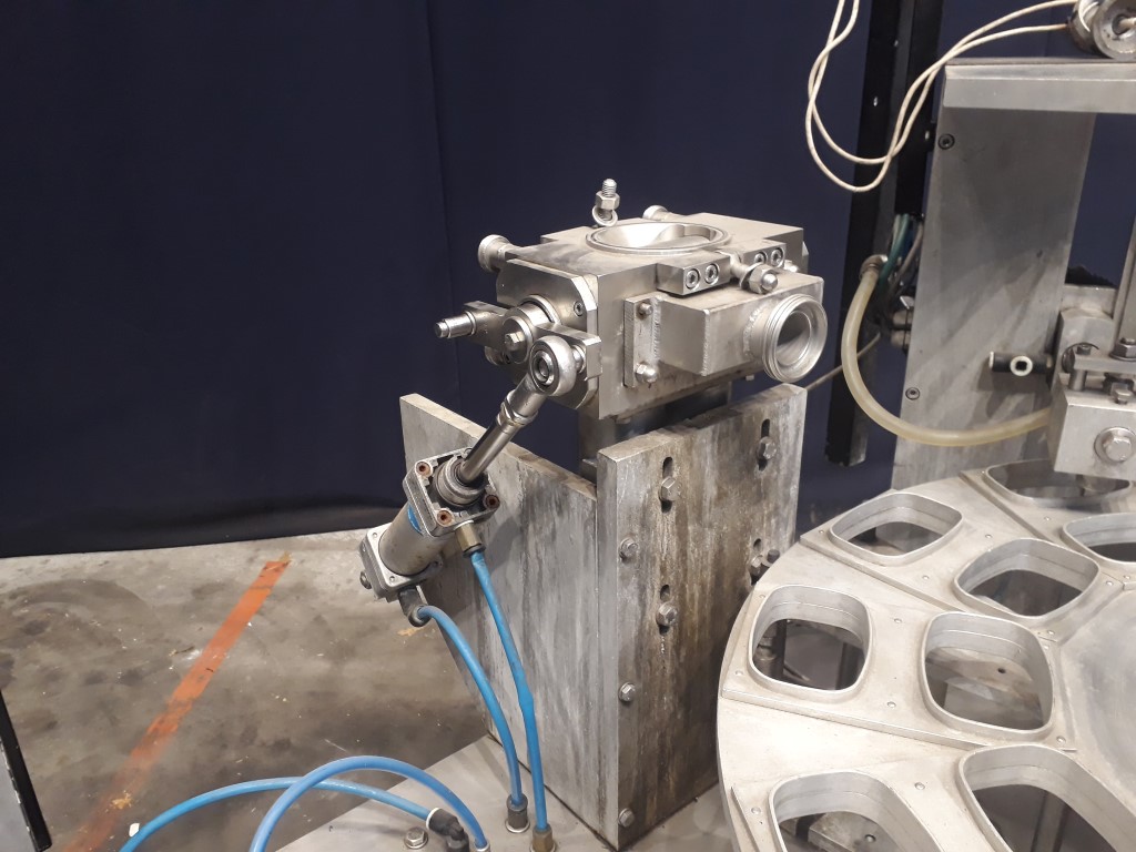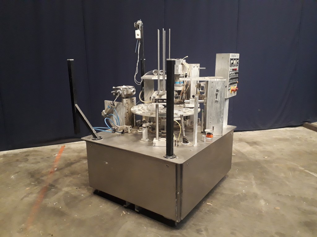 Rotary filling, sealing and snap cap machine. 12-Steps. Cup size oval: ± 122 x 80 mm. Incomplete format set on the machine. Stations: cup destacking, main piston doser for viscose products (100 - 500 ml, excluding hopper and filling valve), preformed seal dispending by vacuum with tip sealing, heat sealing, date coder on seal station, snap-on lid, outfeed, (outfeed conveyor missing). Including Busch 010-118 vacuumpump. Total dimensions: 160 x 160 x 220 cm.
