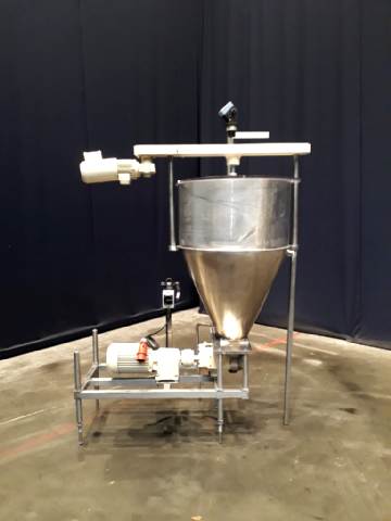 Lobbe pump with duo stainless steel lobbes. Diameter lobbes: 110 mm. Design pressure: 13,8 bar / 200 PSI. 0,227 liter displacement per revolution. Maximum speed 600 rpm. Maximum capacity 8.200 ltr/h. Current motor: unknown (typeshield unreadable). Frame mounted. Hopper of ± 200 ltr with scraper agitator, partly jacketed and levelsensor (Bürkert). Stainless steel cover over electric motor. Connection inlet 1,5'' ISS and outlet 2'' ISS. Total dimensions: 1,7 x 0,9 x 2,2 mtr.