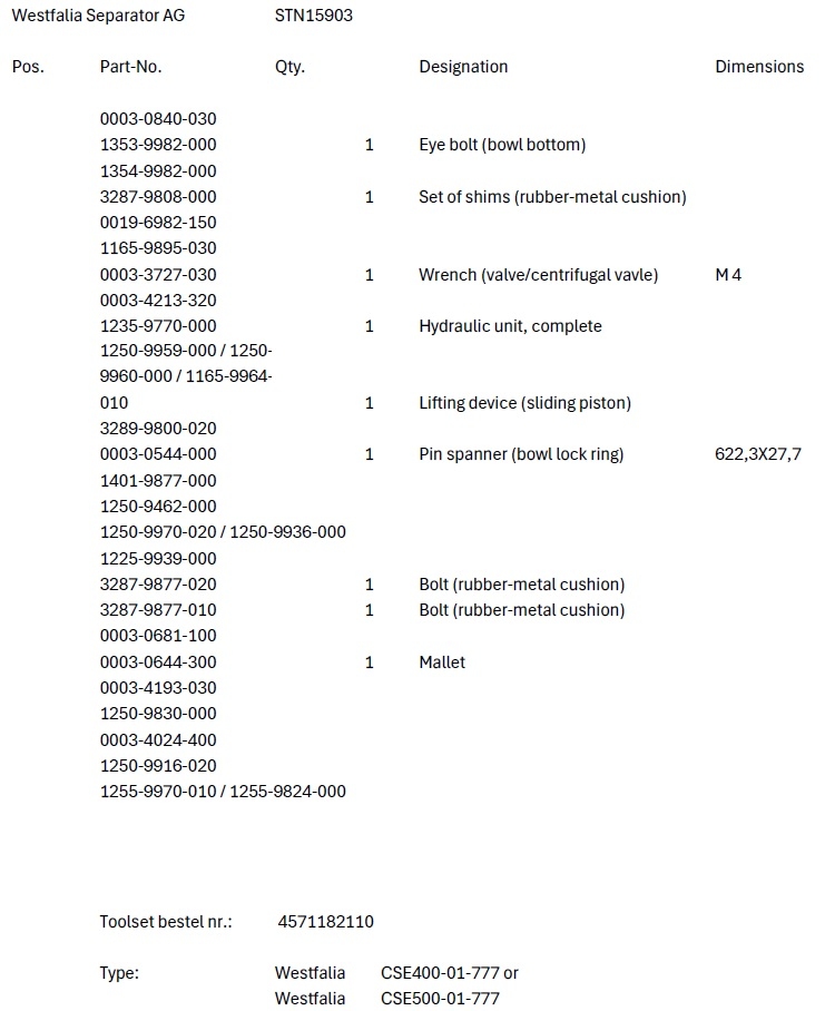 Separator toolset for a CS400-01-777 or a CSE500-01-777 Westfalia bactofuge machine. This set is unused, new condition. Including pressing tool and ringkey which also suits other models like MSE500. List with part numbers available. Complete tool set GEA ordering number: 4571182110