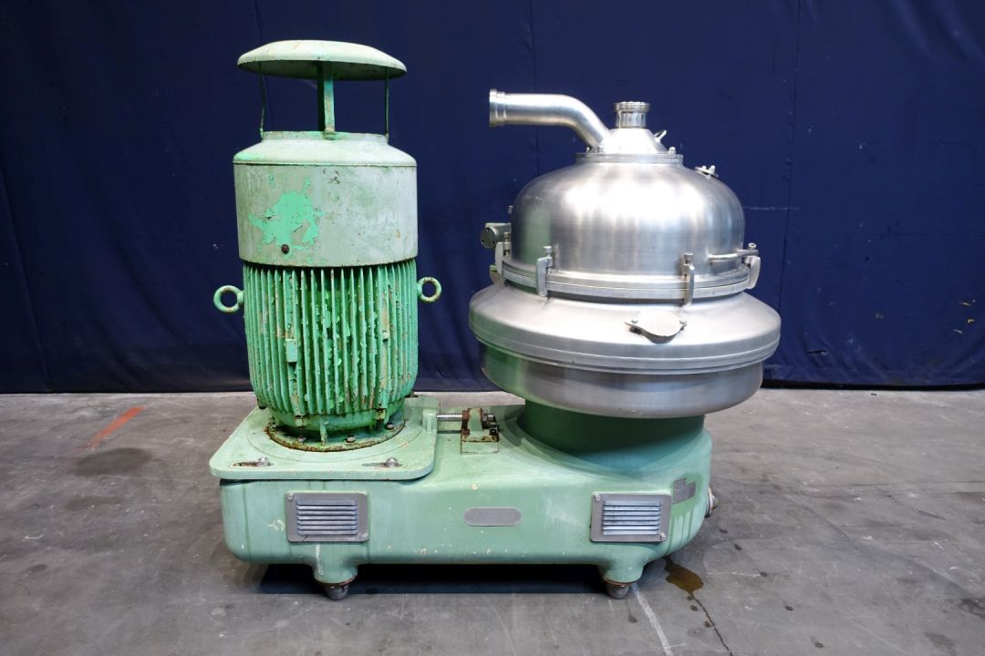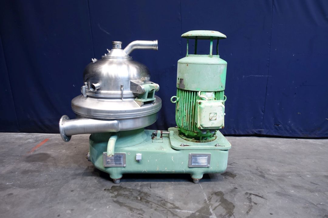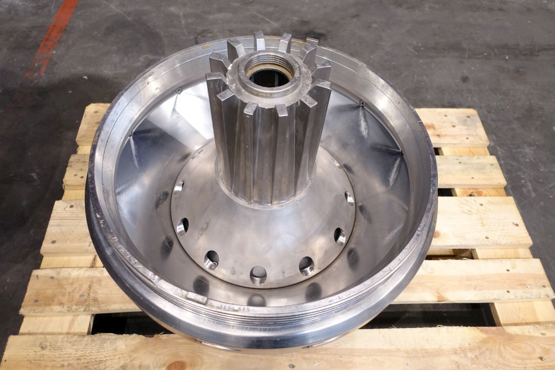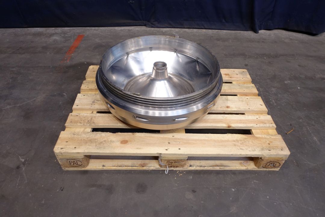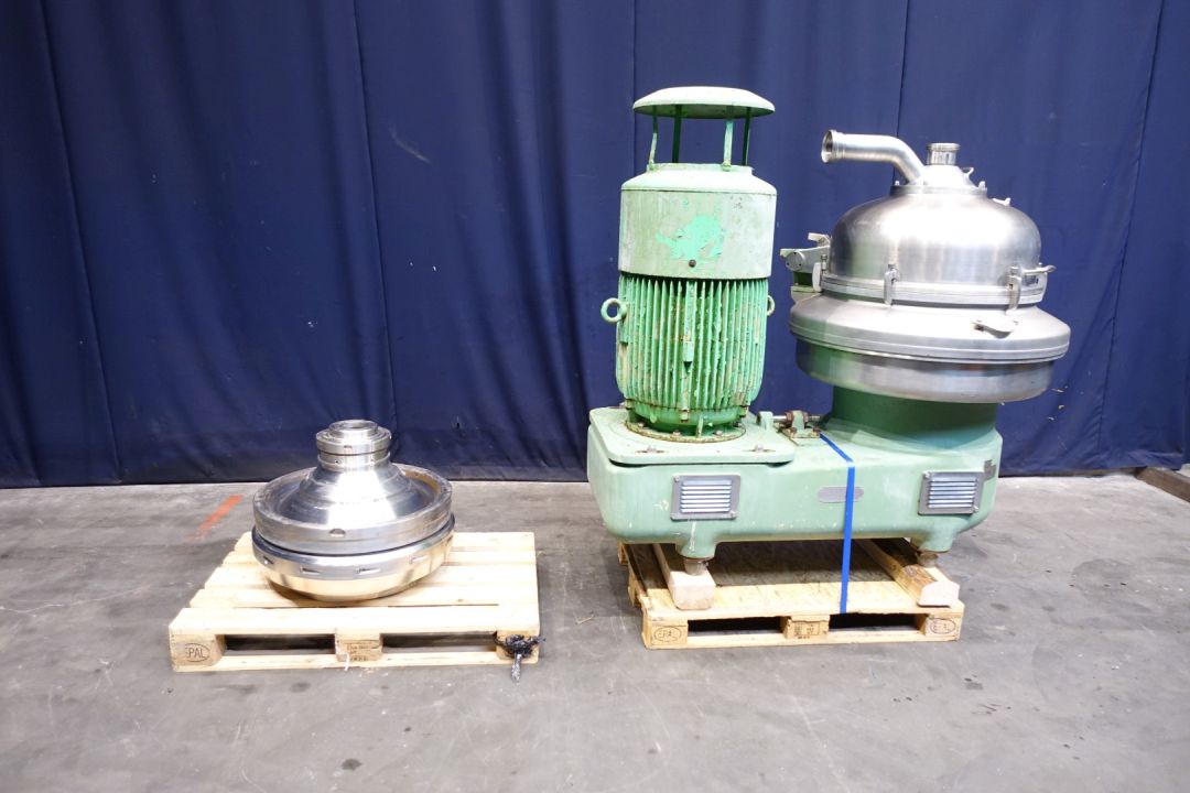 Nozzle disc centrifuge, for parts max bowl speed 3.340 rpm. Kg/dm3 1,2. Nozzles Ø 1,8. Used on product: potato starch. With bowl body but no disks. Motor 70 kW - 127 A - 2950 rpm. No tools - No control panel.
