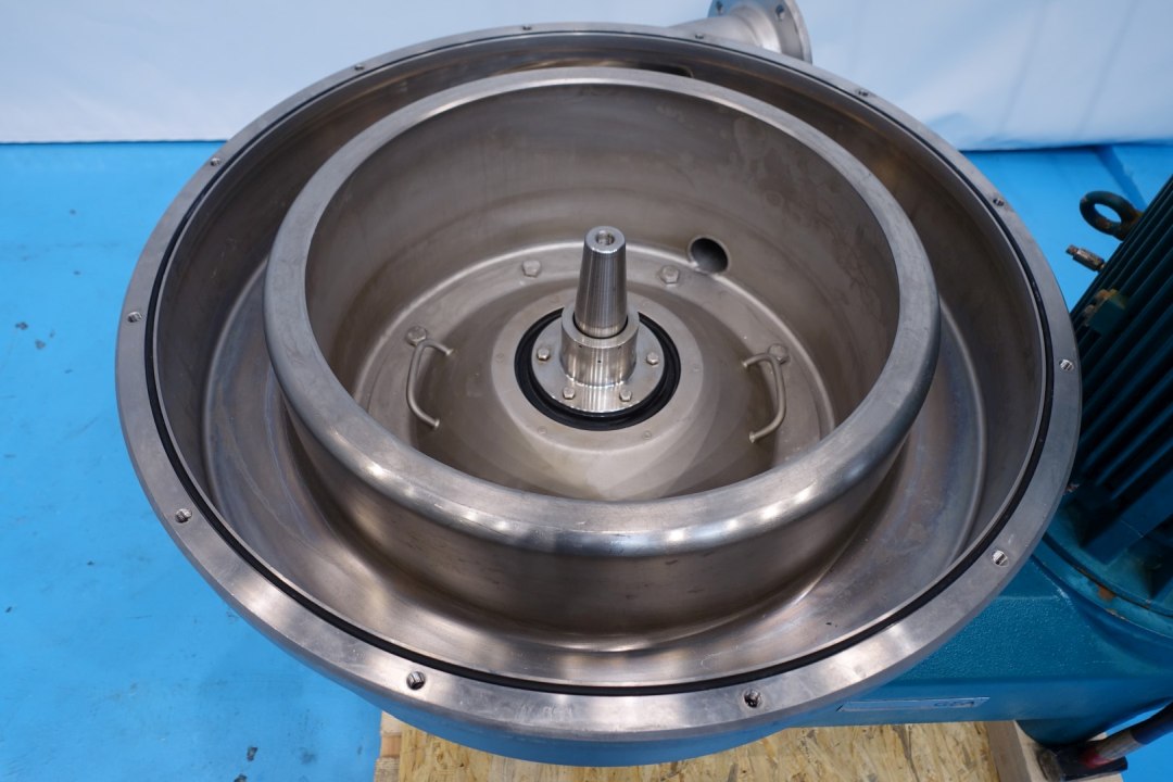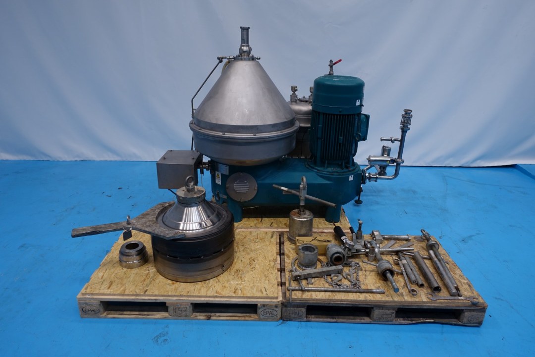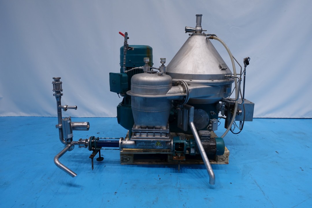 Beer separator - clarifier, self-cleaning. Including bowl, bowl speed: 7.250 rpm, motor cover, solids cyclone with a Seipec eccentric screw pulp outfeed pump, 3 x centrifugal pump, piping,co2 injection valve for blanketing, turbidity sensor , pressure transmitter, Vibro sensor. Flow transmitter, flow control valves, bypass valve, sampler on in and outlet. Maneuvering water valves. Set of needed tools with ring key and pressing tool. Free standing control panel with PLC Siemens Simatic S7-300 controls and frequency controllers of 2 pumps and separator. Centrifugal pump 1: GEA TP2050-200-2-E-K-E-GO-DN65/50-J-J, impellor 200 mm, connections In: 3,0" Din - Out: 2,5" Din. Centrifugal pump 2: GEA TP3050-150-2-E-K-E-GO-DN65/50-J-J, impellor 150 mm, connections In: 3,0" Din - Out: 2,5" Din. Centrifugal pump 3: NN, impellor 120 mm, connections In: 2 "Din - Out: 2" Din. Capacity: 10hl to 20hl/h. With documentation. Excluding: touchscreen in control panel, precooler PHE.