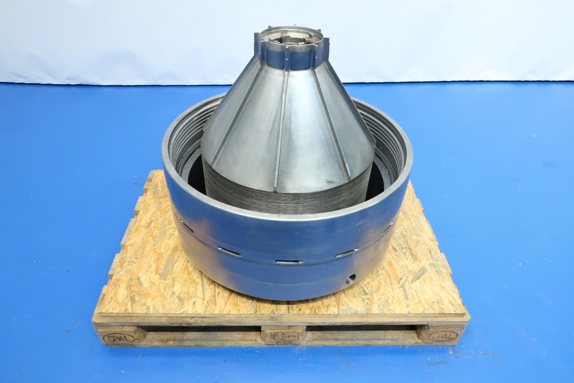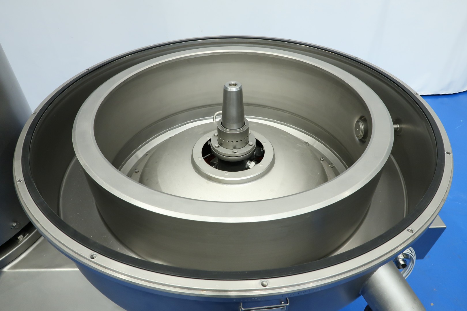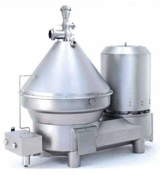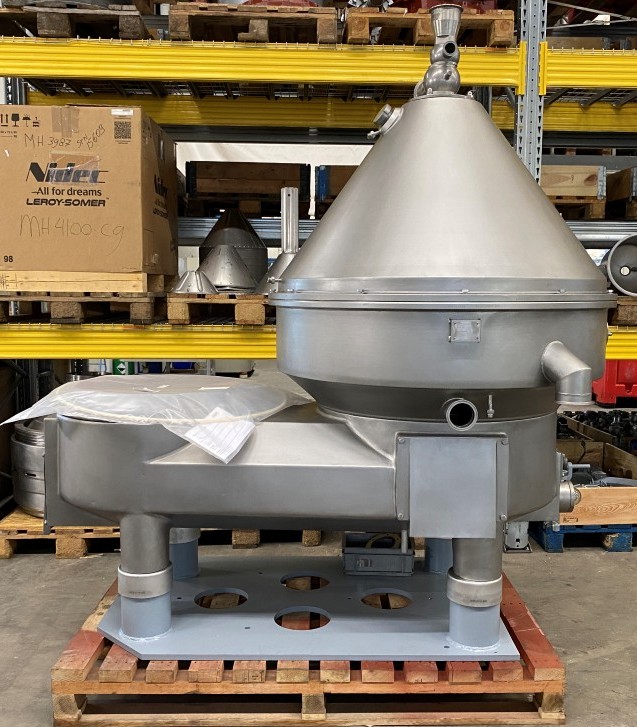 Already reconditioned Milk / whey skimmer, self cleaning. Designed for warm milk or whey skimming, with soft stream inlet. Including bowl, motor, motor cover, base frame, pressure transmitter and pneumatic counter pressure valve on skim side, Flowtransmitter and automatic flow regulation valve for cream, manouvering water valves. Motor 55,0 KW - 92,0 A - 1.791 rpm - 60 Hz. Belt drive. Set of tools with ring key and pressing tool. New controls can be offered as option