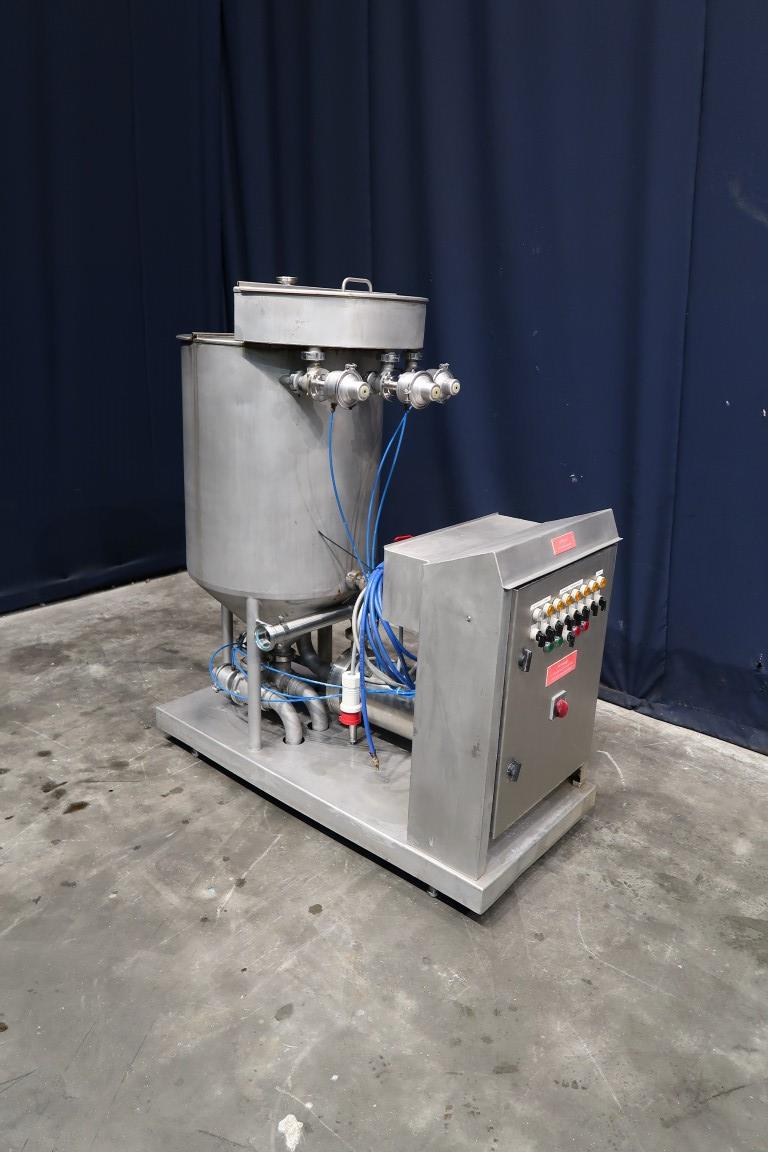 CIP Cleaning unit previously used for a Westfalia KDA Quark separator. Single jacketed tank with lid. Dimensions of the tank: diameter 60 cm and height 70 cm. Centrifugal pump, Anema, CCGM 4044/155, motor 3 kW - 6,7 A - 2840 rpm, capacity: 20.000 ltr/h, pressure 2,4 bar. Control panel with relays controls. Total dimensions: 140 x 65 x 155 cm.