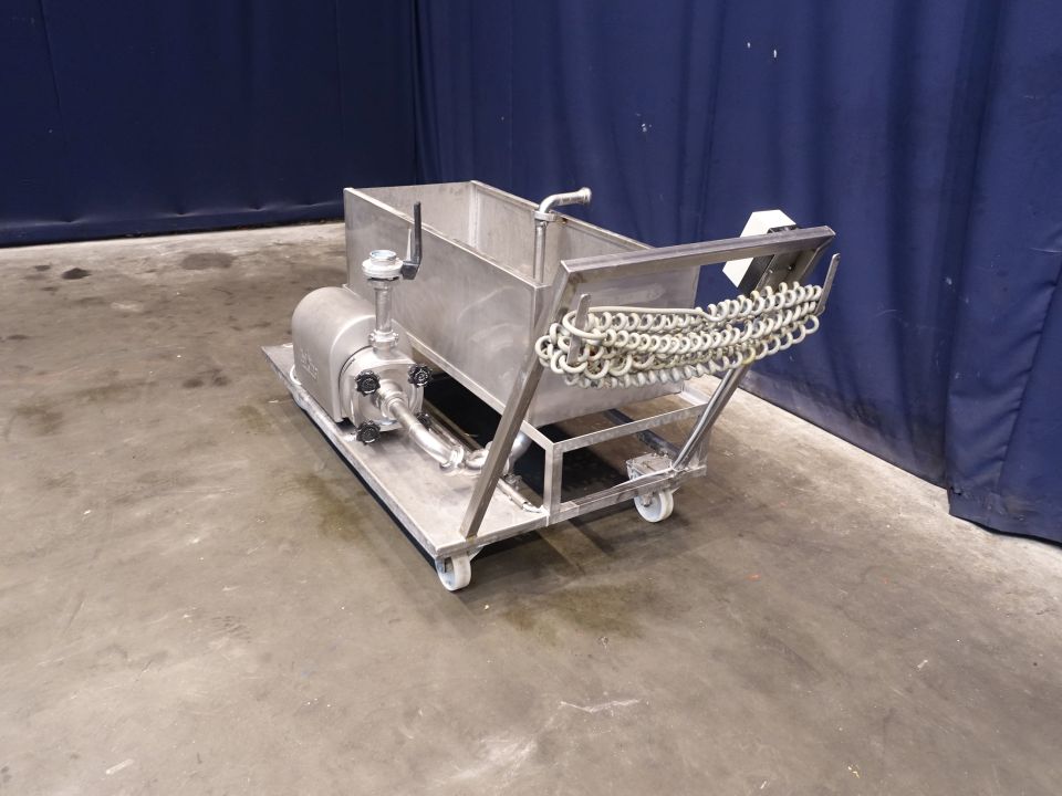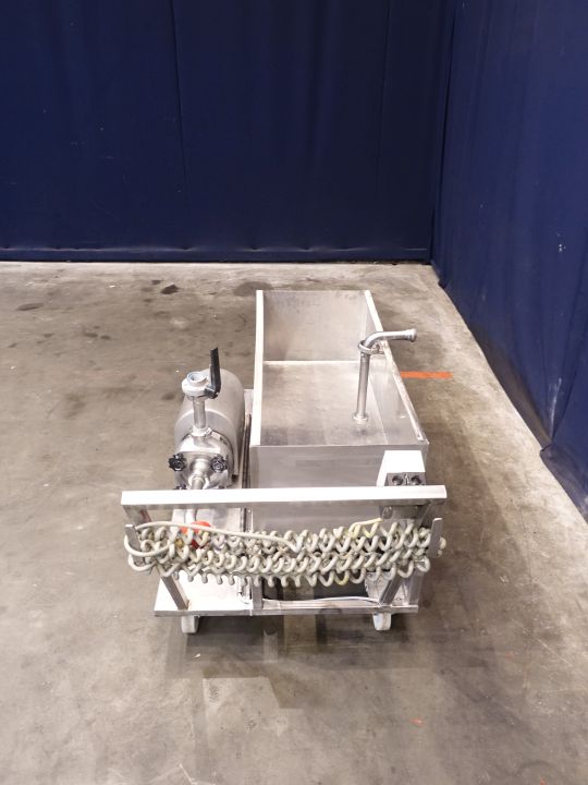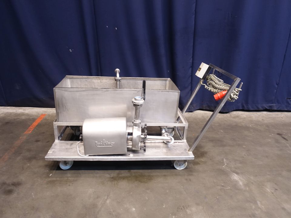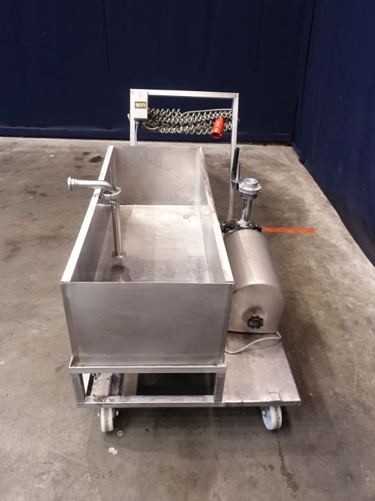 Mobile, frame mounted, single jacketed CIP open vat complete with Wiking centrifugal pump. Motor: 2,2 kW - 2840 rpm. Impellor diameter 160 mm. Connections: DN50 / DN50, DIN. Inside dimenions of the open vat: 112 x 48 x 35 cm. Total dimensions: 165 x 80 x 100 cm.