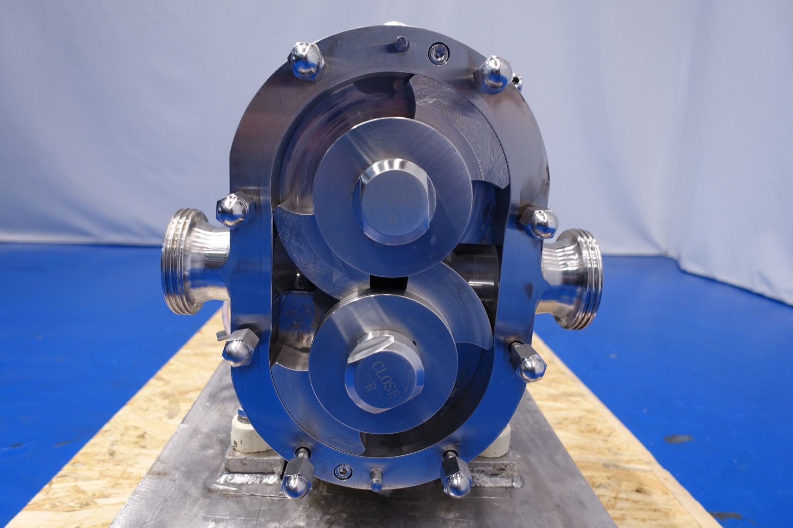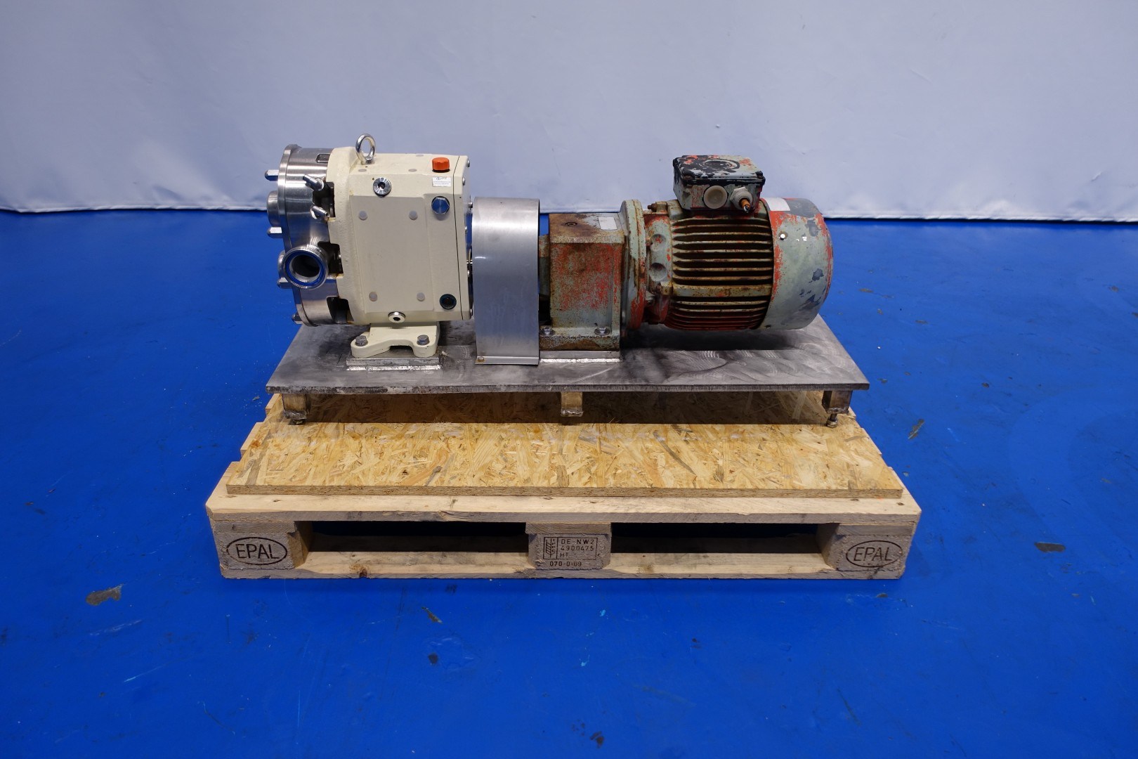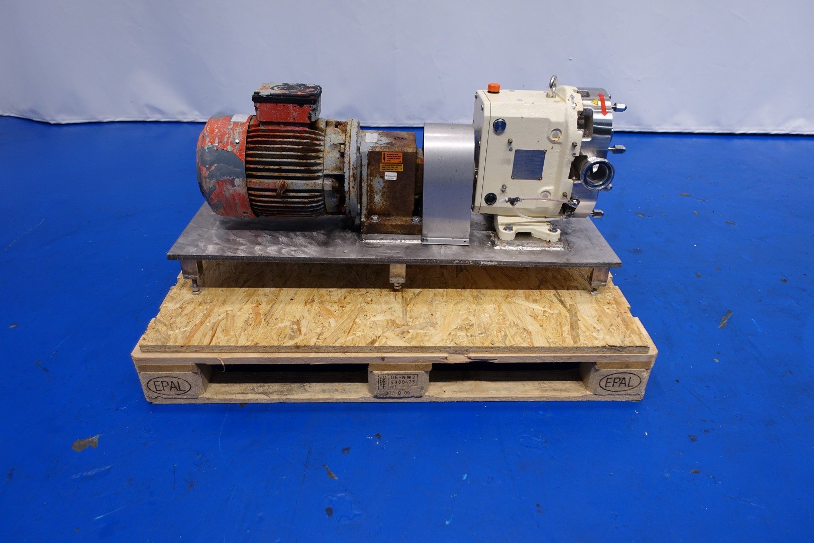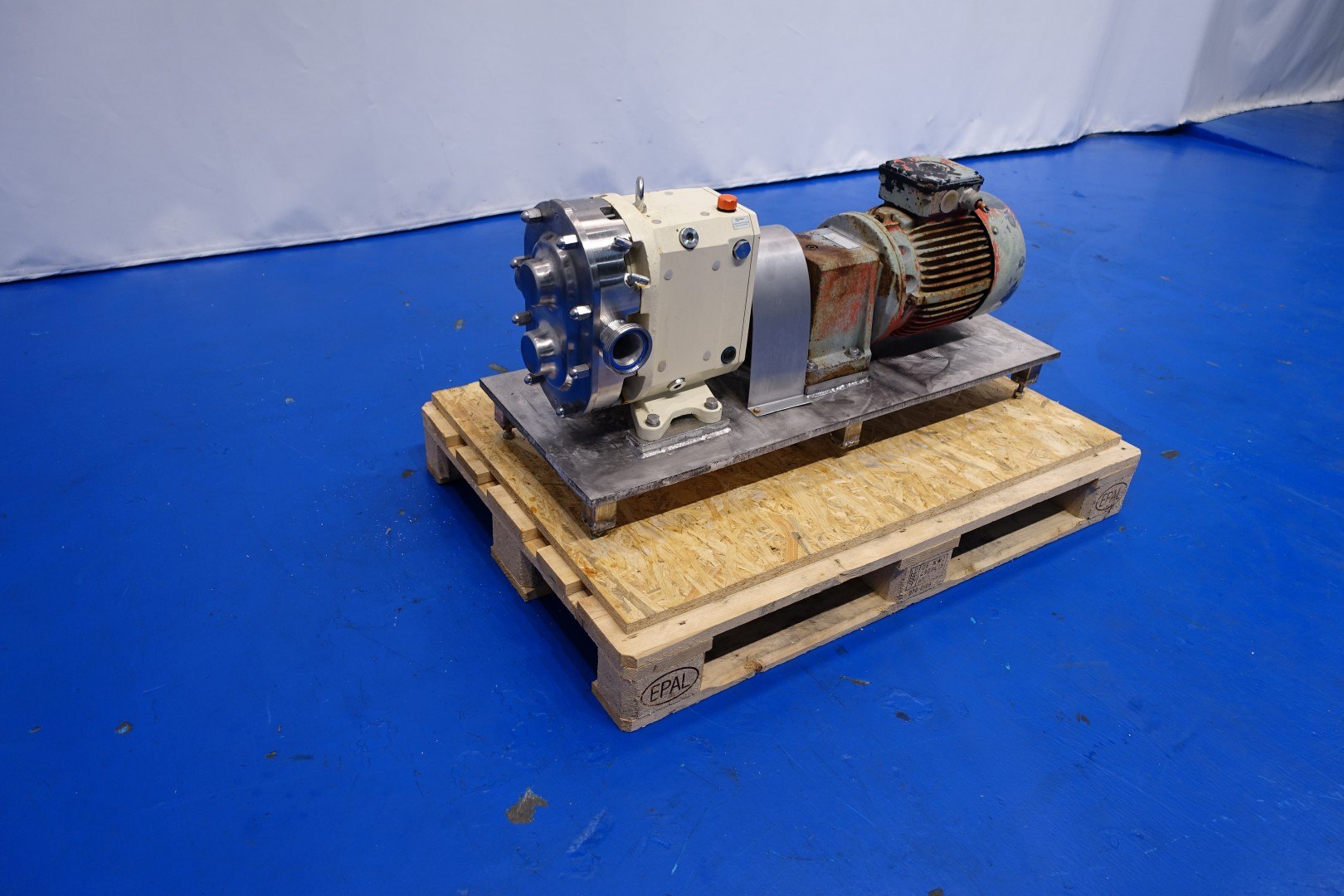 Lobbe pump with duo stainless steel lobbes. Diameter lobbes: 160 mm. Displacement per revolution: 0,6 ltr/min. Nominal capacity 9.720 ltr/h. Current drive work: motor: 5,5 kW - 11,9 A - n1: 1.440 rpm - i= 5,19 - n2: 270 rpm. Design pressure max 16 bar - max temperature 130 °C. Flushed seal. Mounted on plate with 6x adjustable feet. Order no. A18H2370. Connections: (in) DN50 Din11851 / (out) DN50 Din11851. Total dimensions: 110x40x52 (lxwxh) cm - weight: 270 kg.